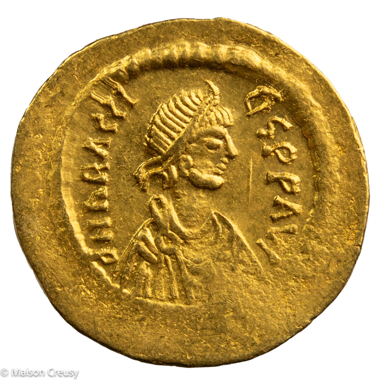 Petit semissis de l’empereur byzantin Heraclius, monnaie en or frappée à Constantinople en 610-613. Buste à droite à l’avers et Croix sur un globe au revers