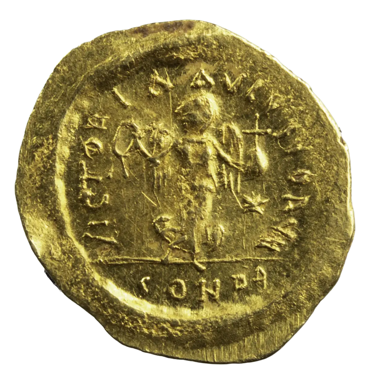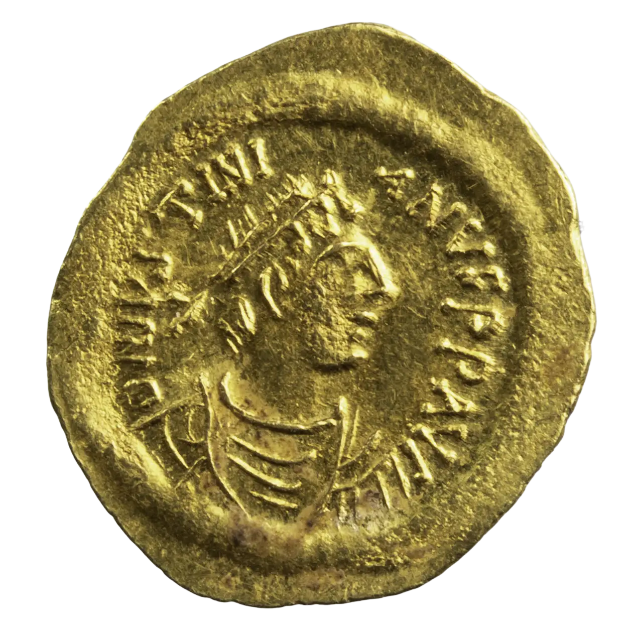Tremissis en or de l’empereur byzantin Justinien I, monnaie frappée en 527-565 à Constantinople.