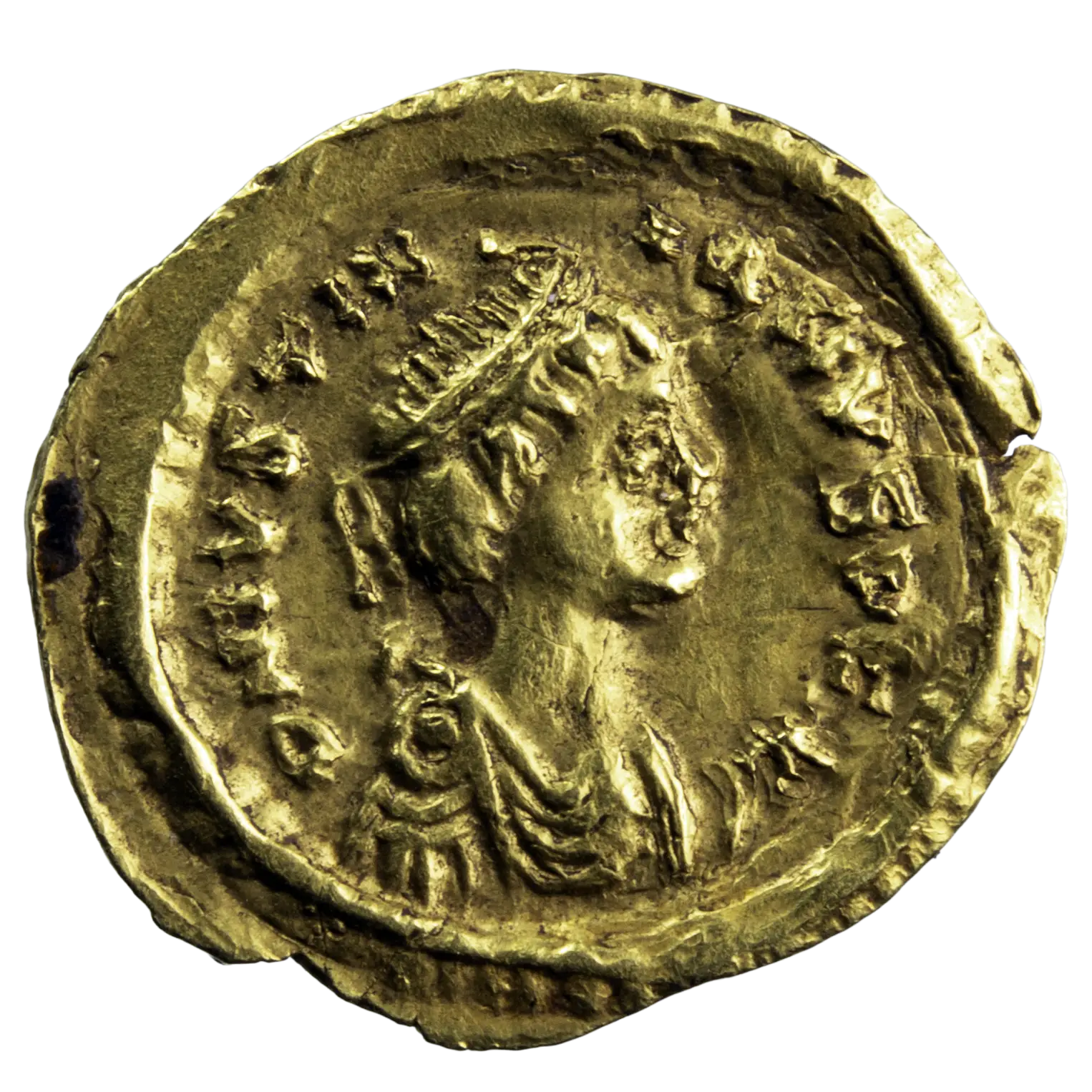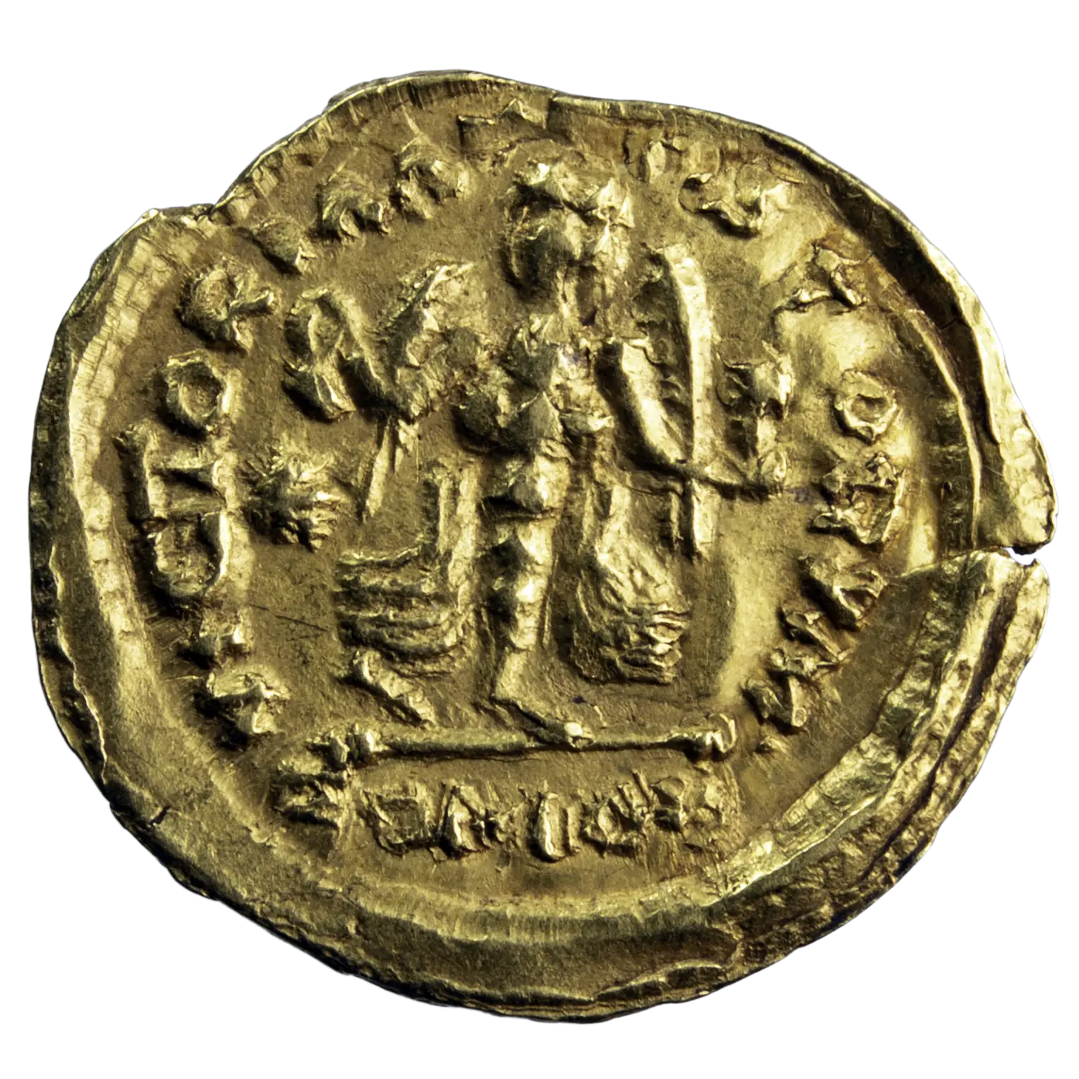 Ce tremissis ostrogoth au nom de Justinien Ier frappée au temps d’Athalaric, illustre la période de transition entre Rome et les royaumes barbares au VIᵉ siècle. Bien que les Ostrogoths règnent alors sur l’Italie, ils continuent de frapper des monnaies au nom de l’empereur byzantin, symbole de légitimité impériale.