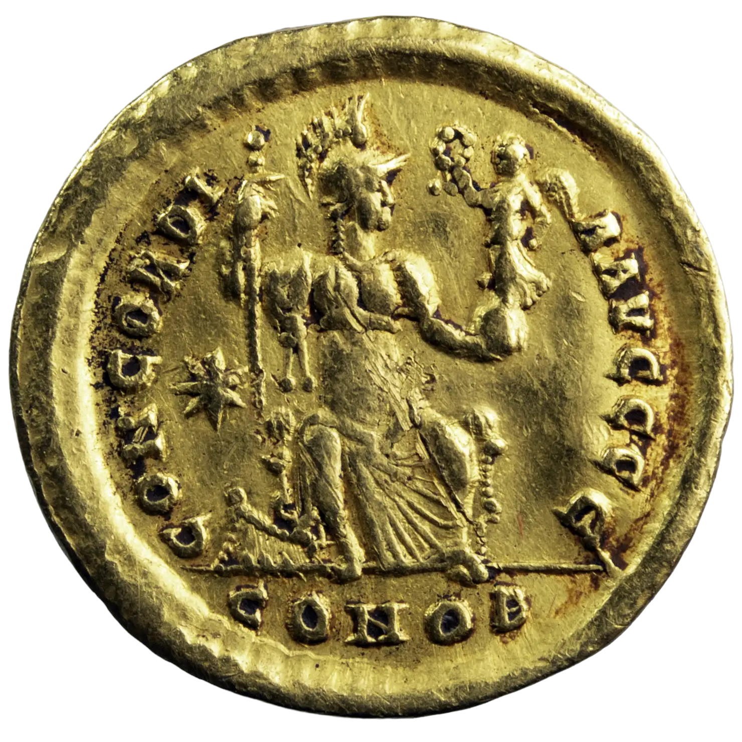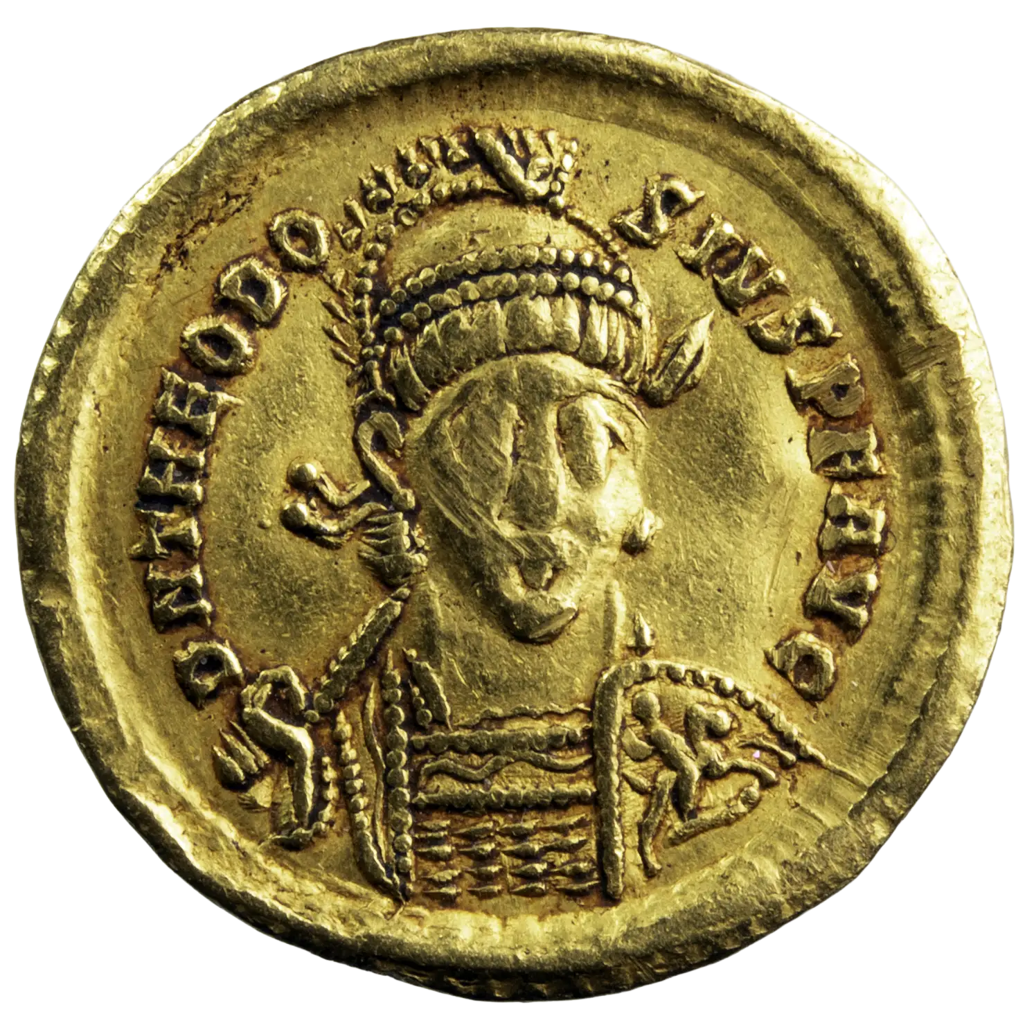 Solidus de l’empereur Theodose II, monnaie frappée à Constantinople vers 403-408. Buste de l’empereur de face à l’avers