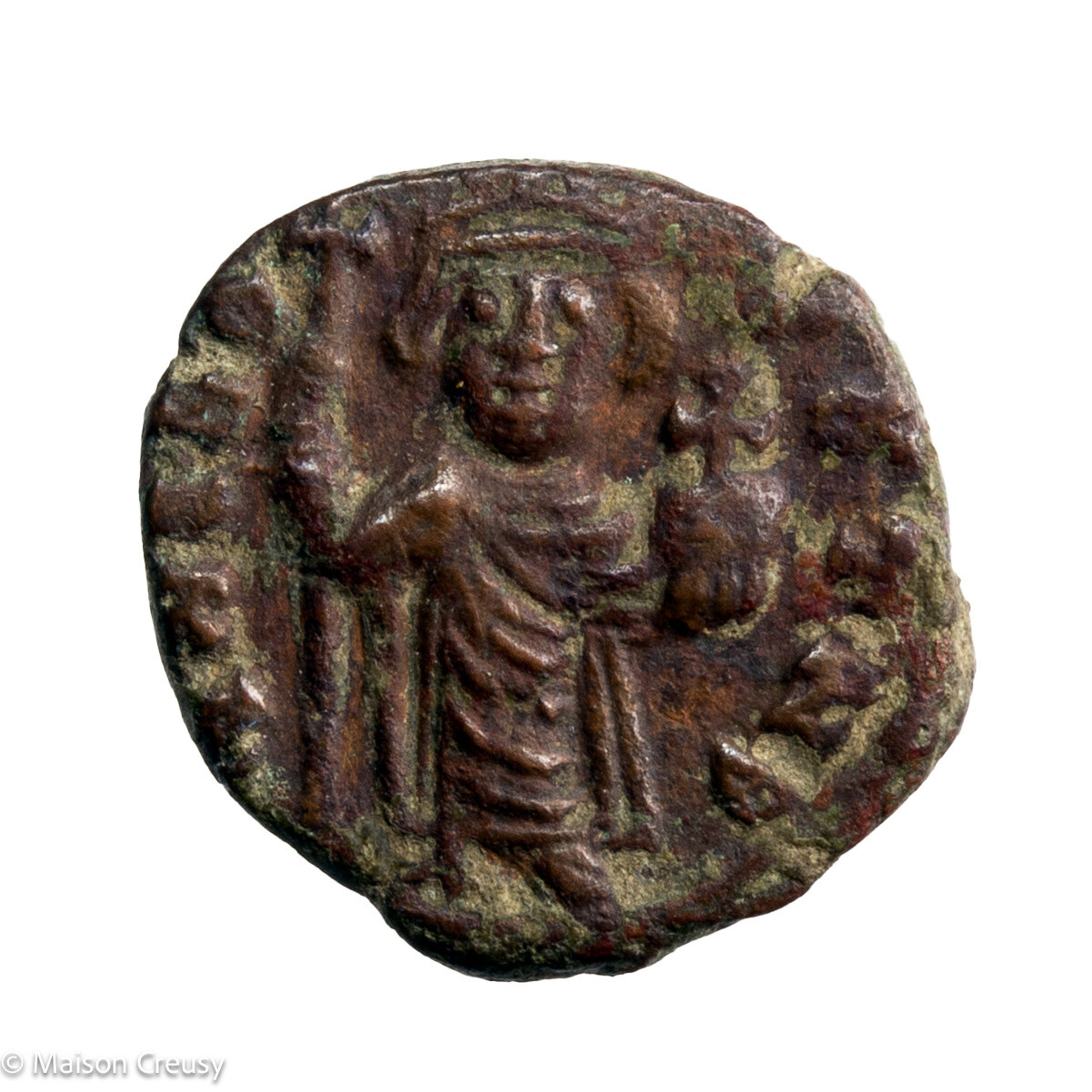 Monnaie en bronze de l’empereur byzantin Constans II, 1/2 follis frappé à Carthage vers 641-643 après JC. Constans II debout de face tenant une longue croix à l’avers. K au revers