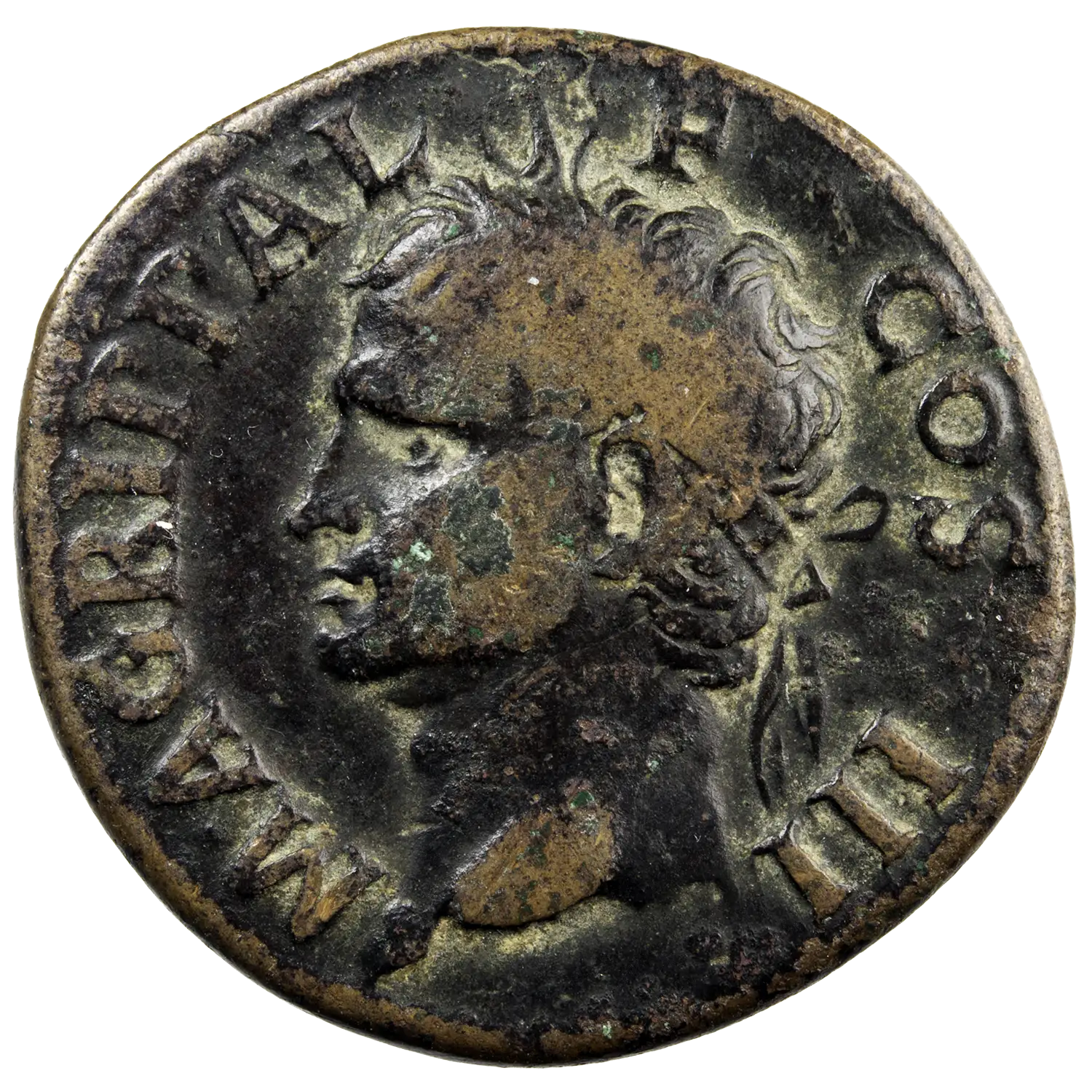 Avec cette monnaie Caligula rend hommage à Marcus Vipsanius Agrippa, fidèle lieutenant et gendre d’Auguste, célèbre pour ses victoires militaires et ses grands travaux à Rome.