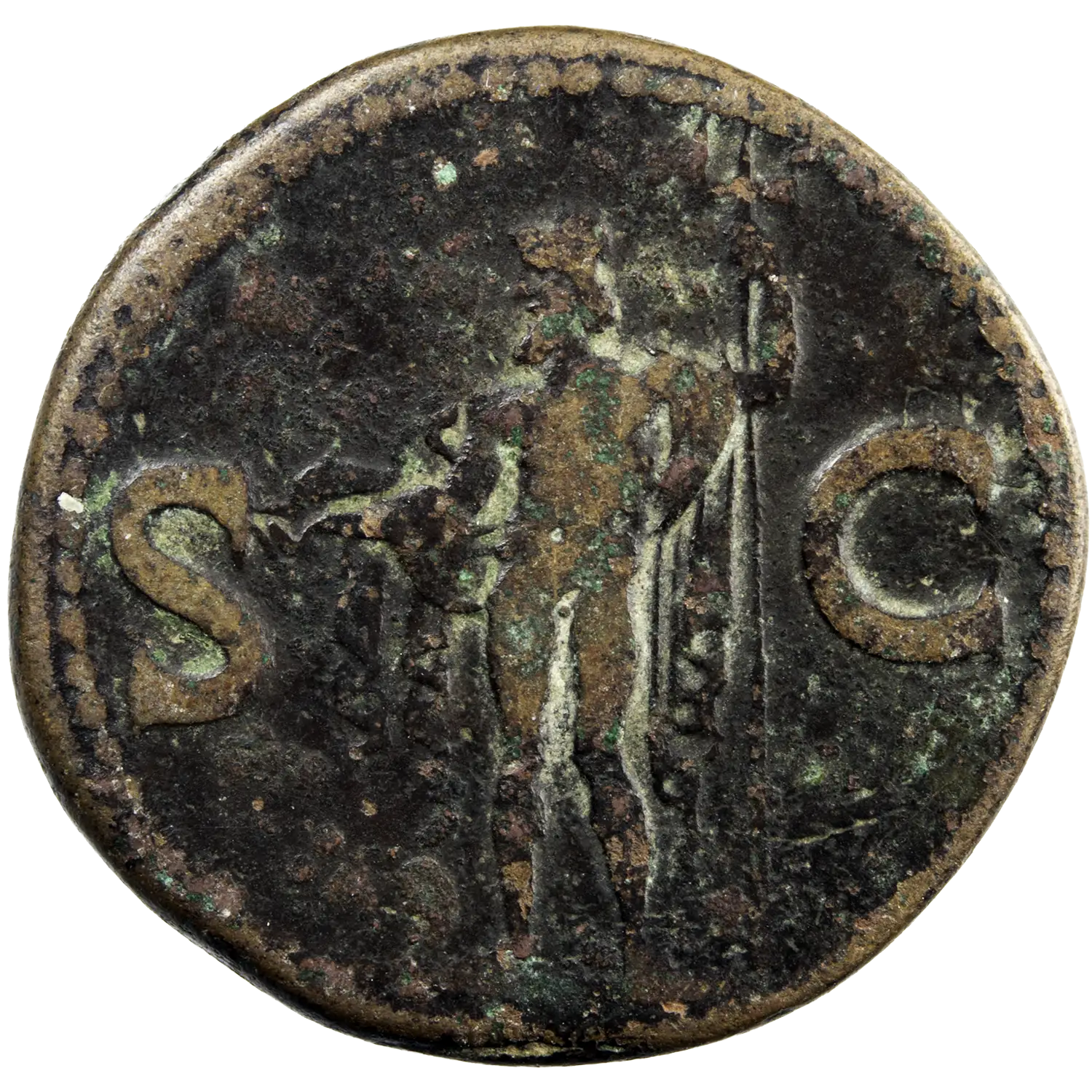 As en bronze d’Agrippa mort en 12 avant JC. Monnaie frappée sous Caligula vers 37-41 après JC. Neptune debout tenant un trident et un dauphin au revers.