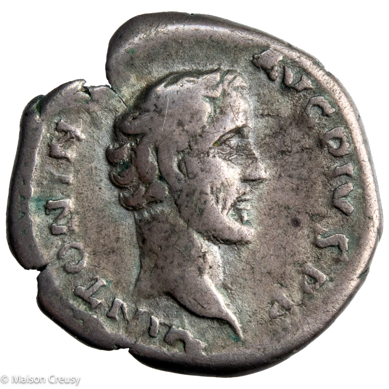 Denier en argent de l’empereur romain Antonin le Pieux, monnaie frappée en 138-139 à Rome. Deux mains jointes tenant un caducée au revers