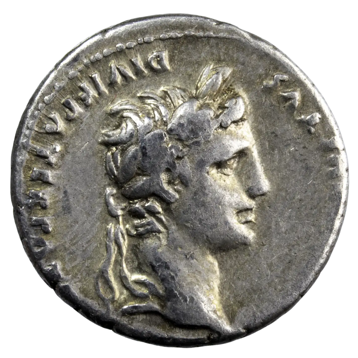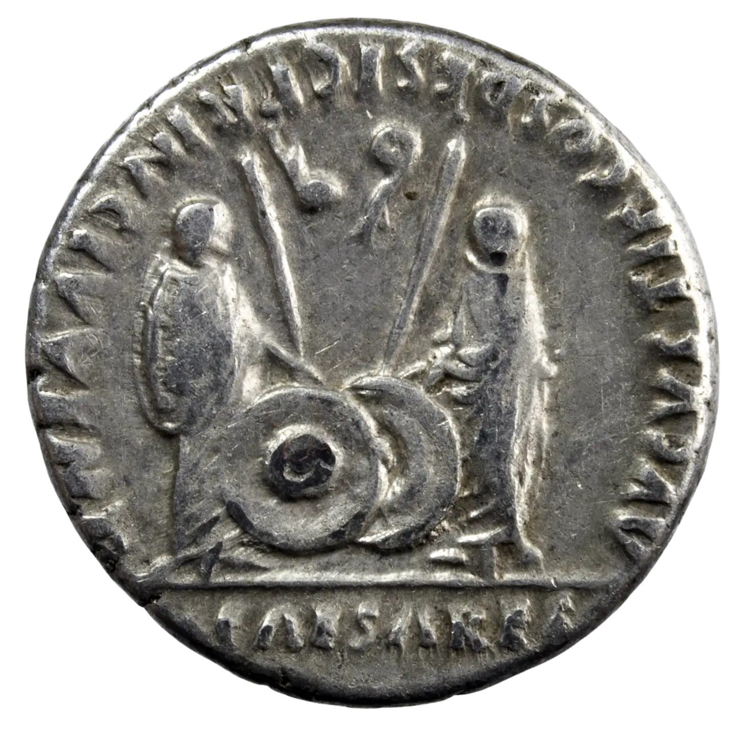 Ce denier d’Auguste, est l’une des monnaies les plus emblématiques de l’Empire romain, frappée à Lugdunum (Lyon) entre 2 av. J.-C. et 4 apr. J.-C. L’avers montre le buste lauré de l’empereur, tandis que le revers honore ses petits-fils et héritiers, Caius et Lucius César, debout avec boucliers et lances. Cette pièce servait d’outil de propagande essentiel pour affirmer la stabilité de la dynastie julio-claudienne. Elle se distingue par les instruments pontificaux (simpulum et lituus) placés entre les deux princes, soulignant leur piété et leur futur rôle politique.