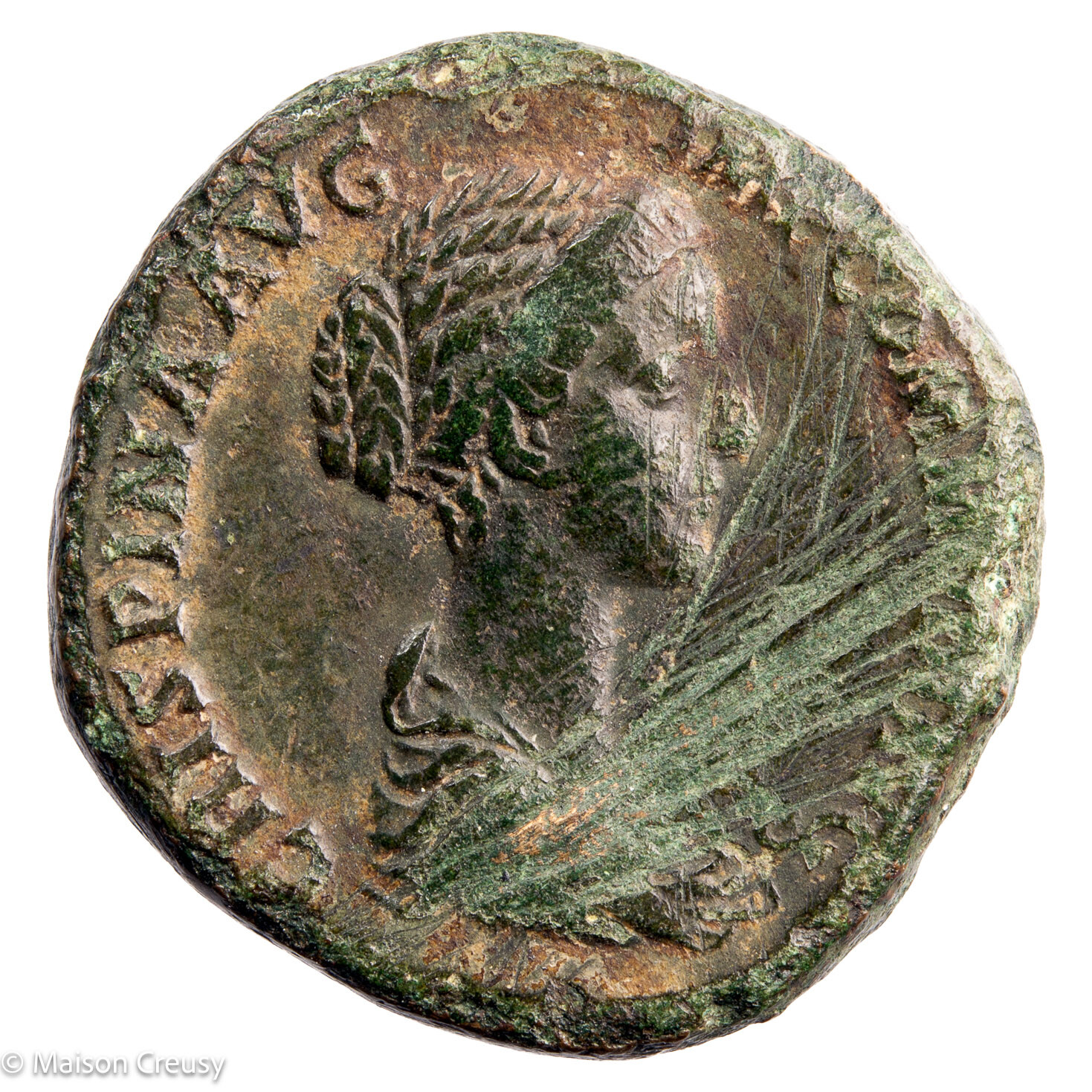 Sesterce en bronze de l’imperatrice Crispine, femme de l’empereur romain Commode. Monnaie frappée vers 178-180 à Rome. La santé assise au revers. De grosses rayures à l’avers