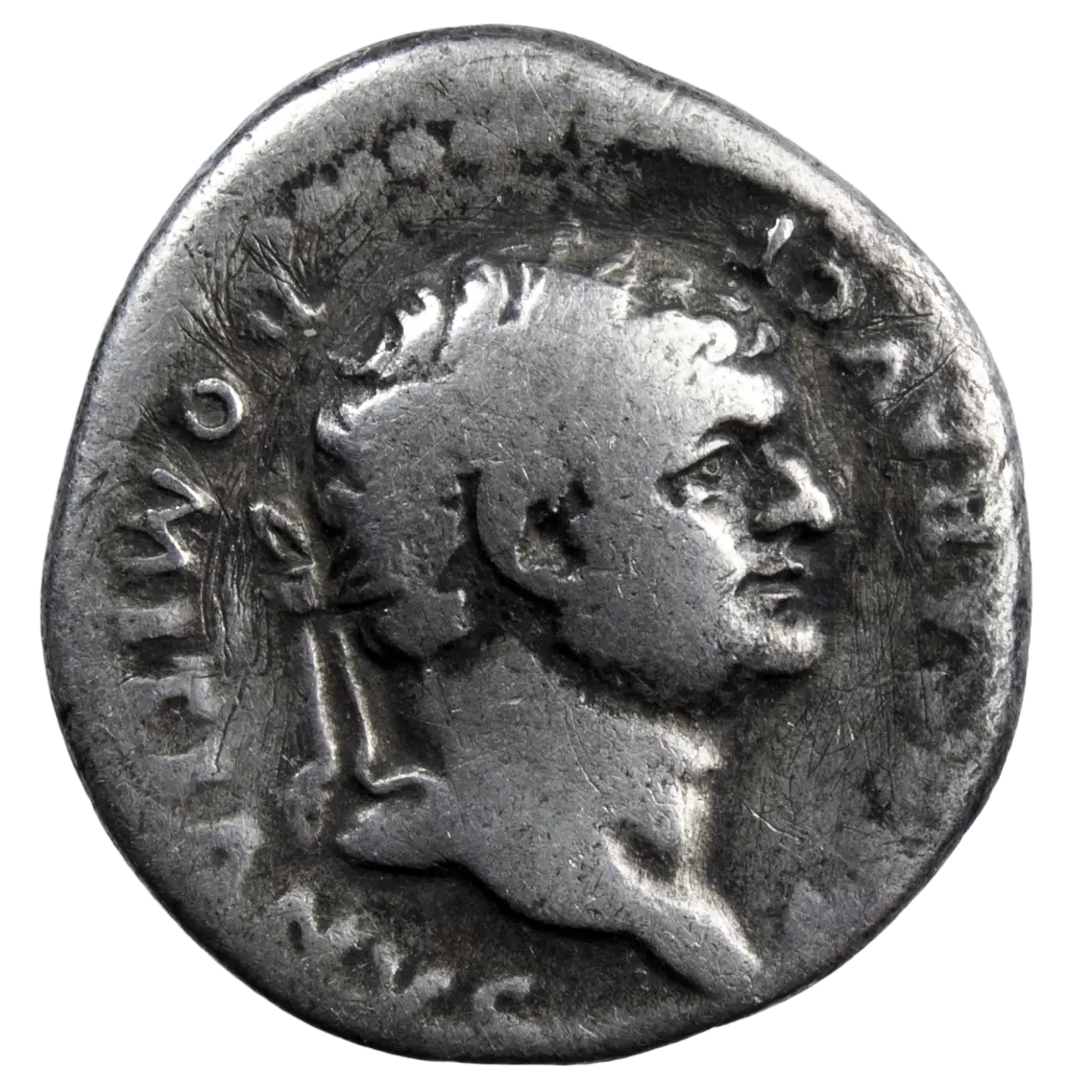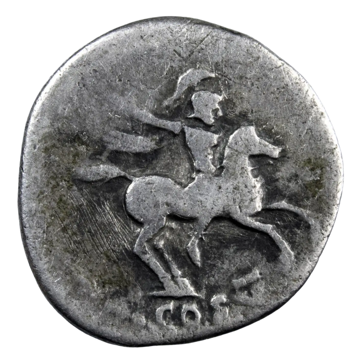 Denier en argent de Domitien en tant que Cesar, monnaie frappée à Rome en 77 sous le règne de Vespasien. Cavalier casqué à droite au revers