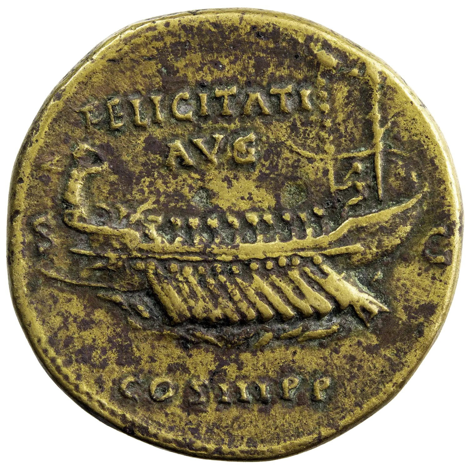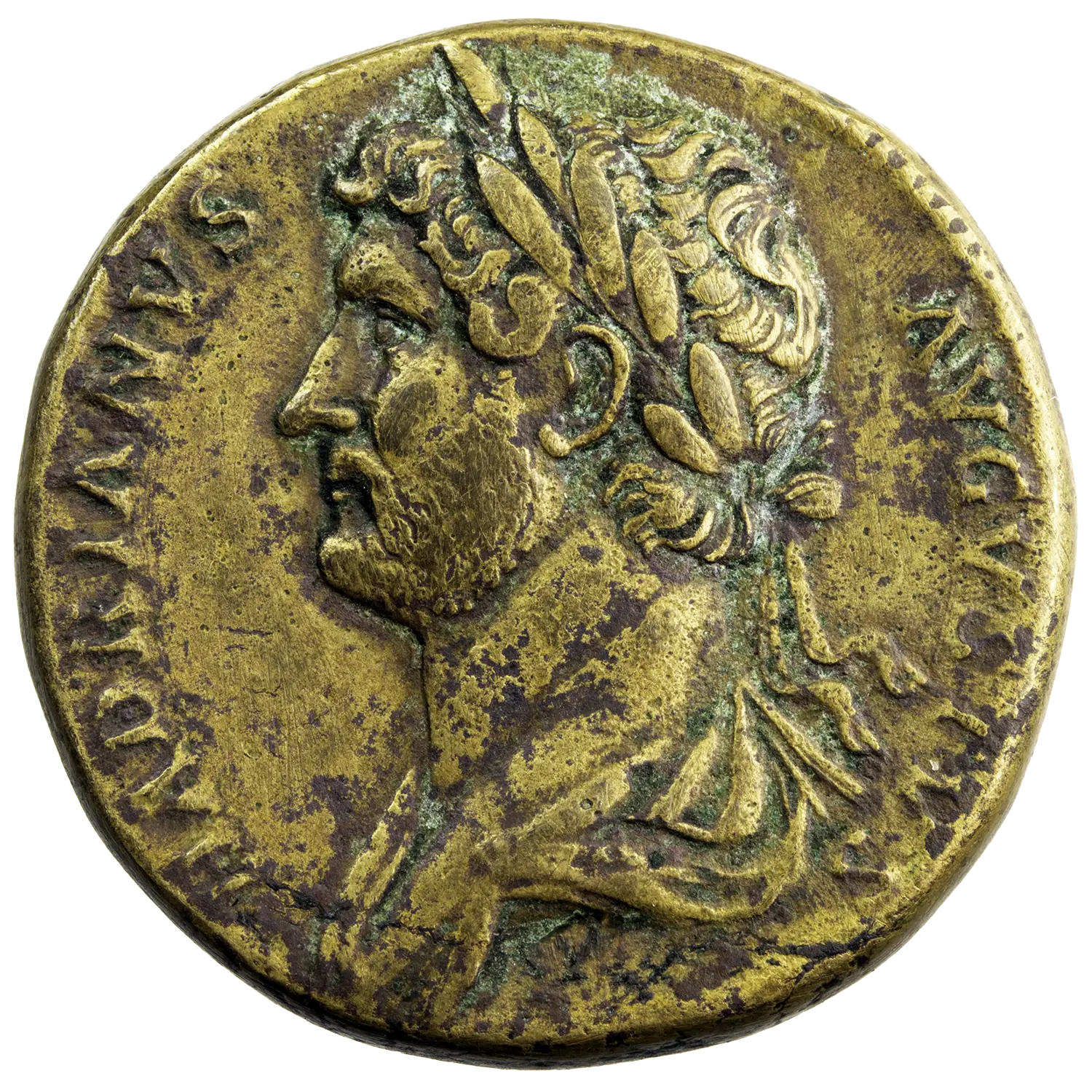 Rare sesterce en bronze de l’empereur romain Hadrien, frappé entre 129 et 130 apr. J.-C. L’avers présente un buste lauré d’Hadrien tourné à gauche, tandis que le revers montre une galère voguant à droite, symbole des voyages impériaux et du contrôle maritime de Rome. Ce type pourrait faire référence à l’un des nombreux déplacements d’Hadrien à travers l’Empire, notamment son séjour en Afrique ou en Asie Mineure. Grand voyageur et administrateur, Hadrien incarne une période de stabilité et d’organisation provinciale dans l’Empire romain.