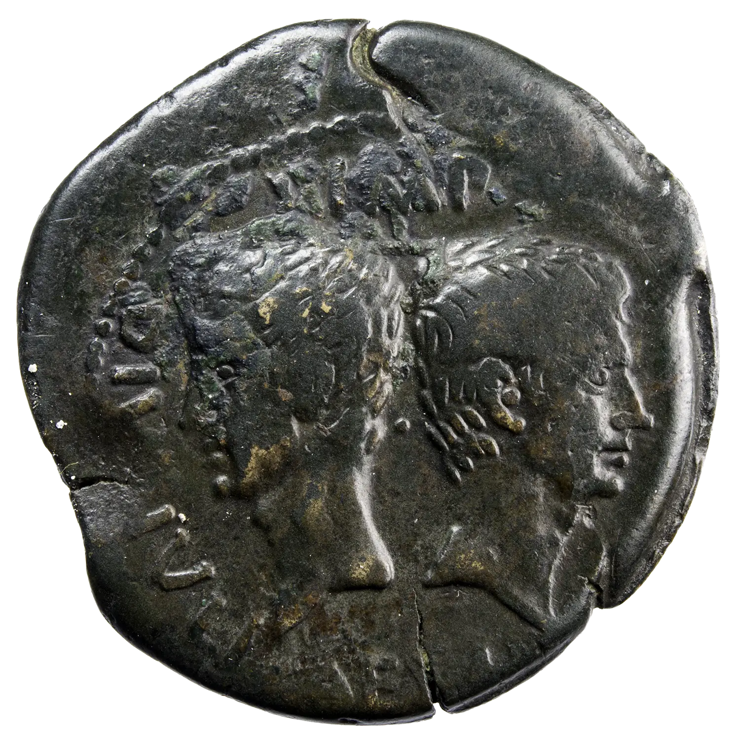 Description avers | Têtes nues adossées de Jules César à gauche et d'Octave à droite |