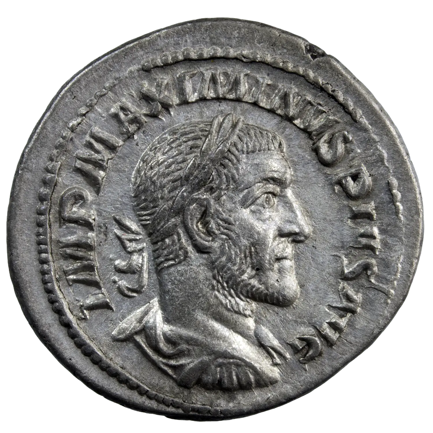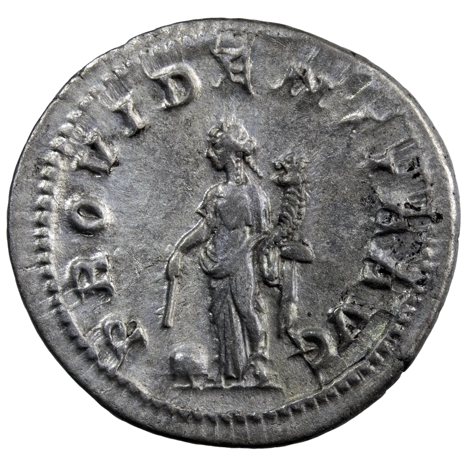 Denier de l’empereur romain Maximin I, monnaie frappée à Rome en 235-236. La providence debout à gauche tenant une baguette et une corne d’abondance