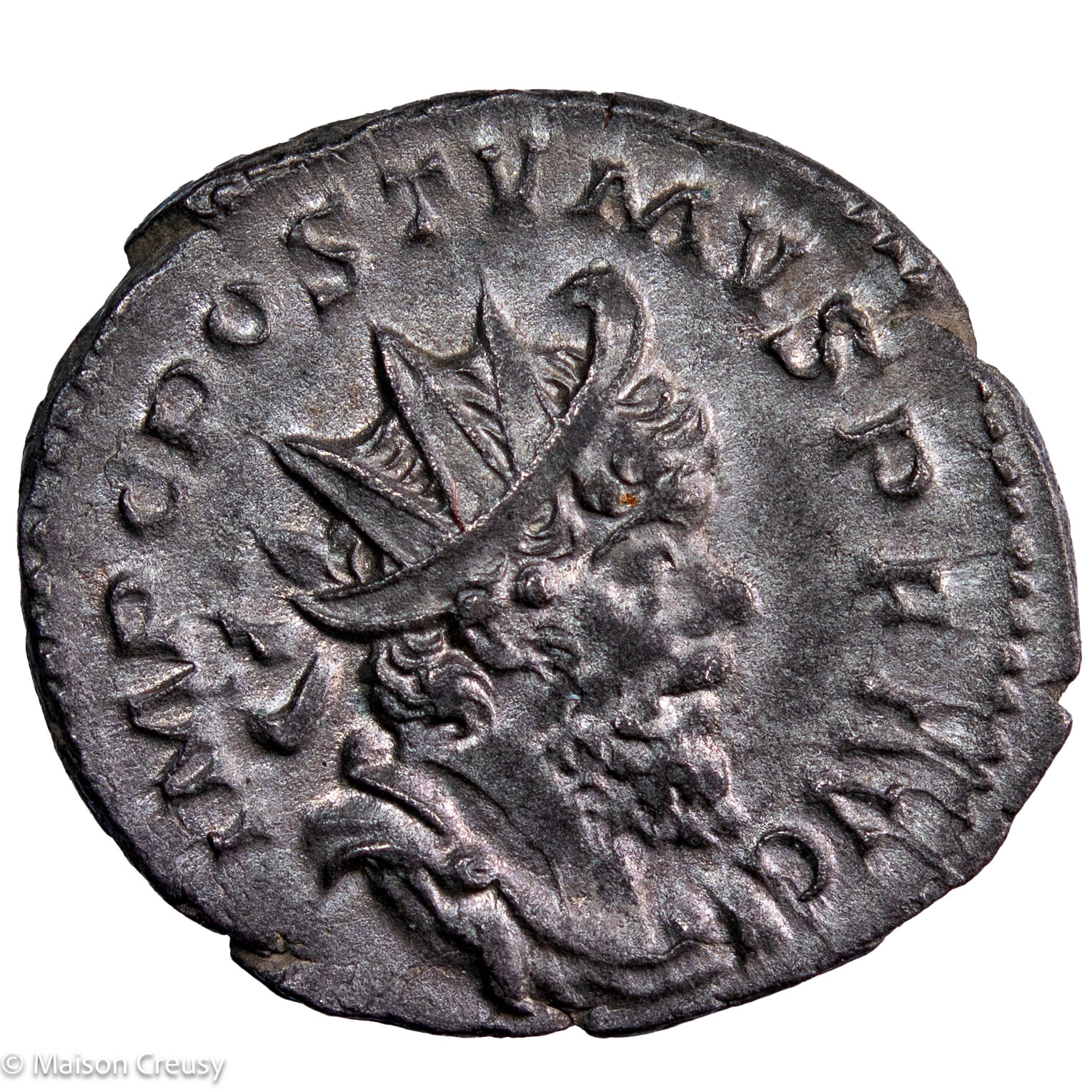 Antoninien de l’empereur Postume qui régnait sur la Gaule, Monnaie en argent frappée en 263 à Trêves