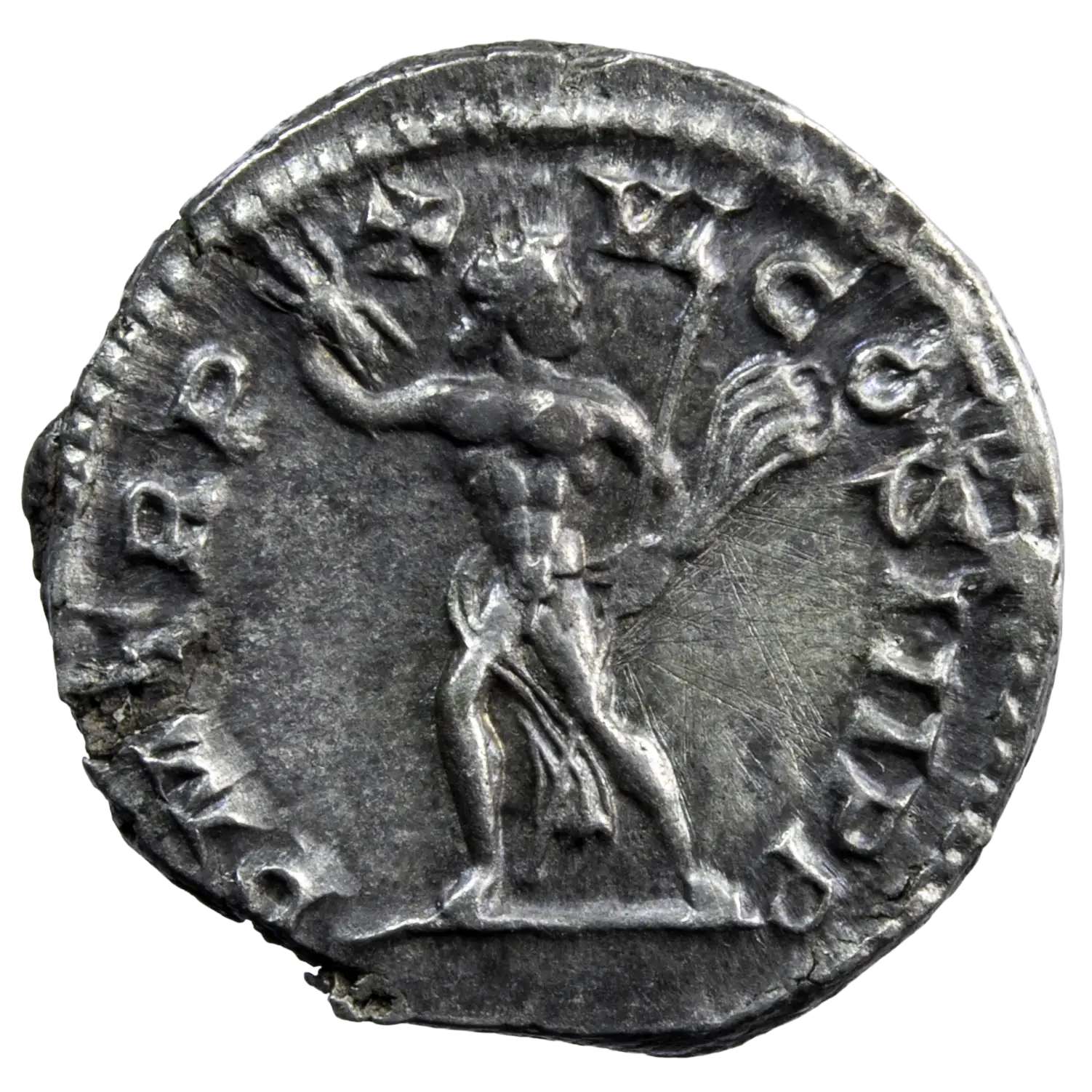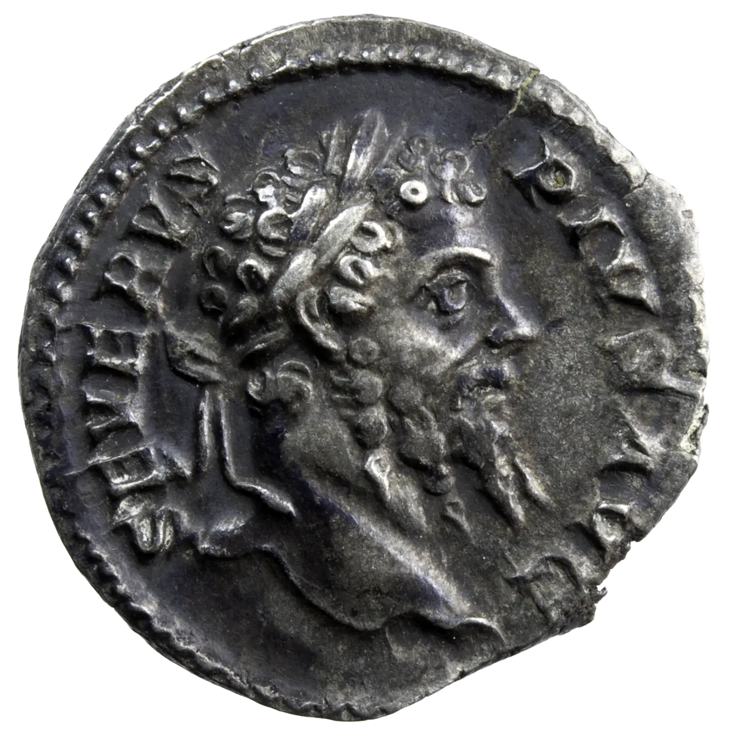 Denier en argent de l’empereur Septime Severe, monnaie frappée en 208 à Rome. Tête laurée de Septime Severe à droite à l’avers et Jupiter au revers
