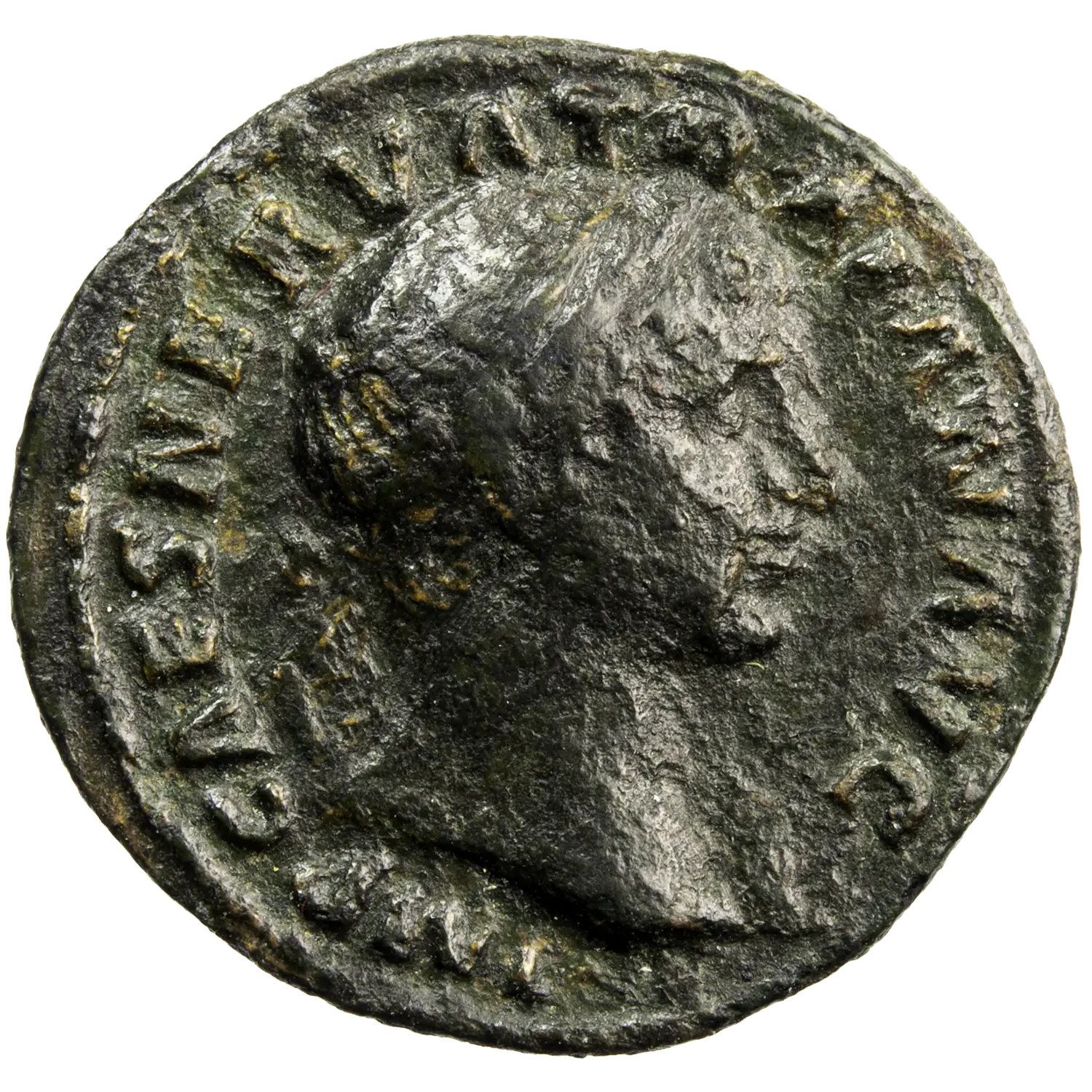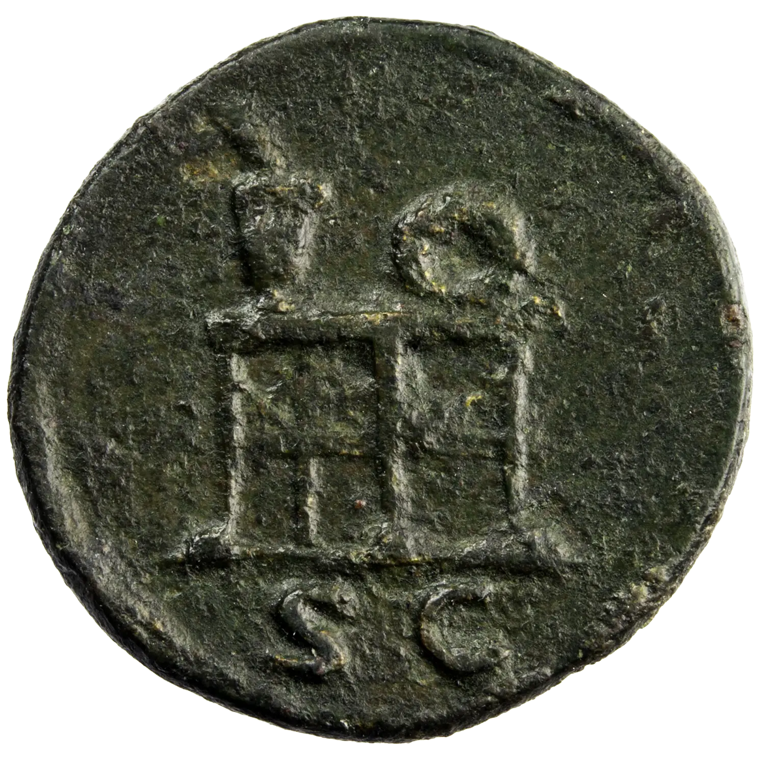 Petit Semis en bronze de l’empereur Trajan frappé en 107-109 à Rome. Portrait de Trajan à l’avers et une table sur laquelle sont posés un vase et une couronne au revers