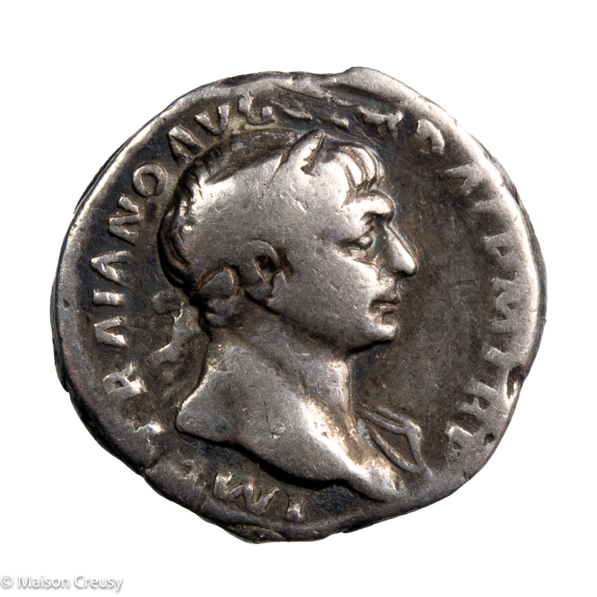 Denier en argent de l’empereur romain Trajan, monnaie frappé à Rome en 107. Victoire debout à gauche tenant une palme et une couronne.