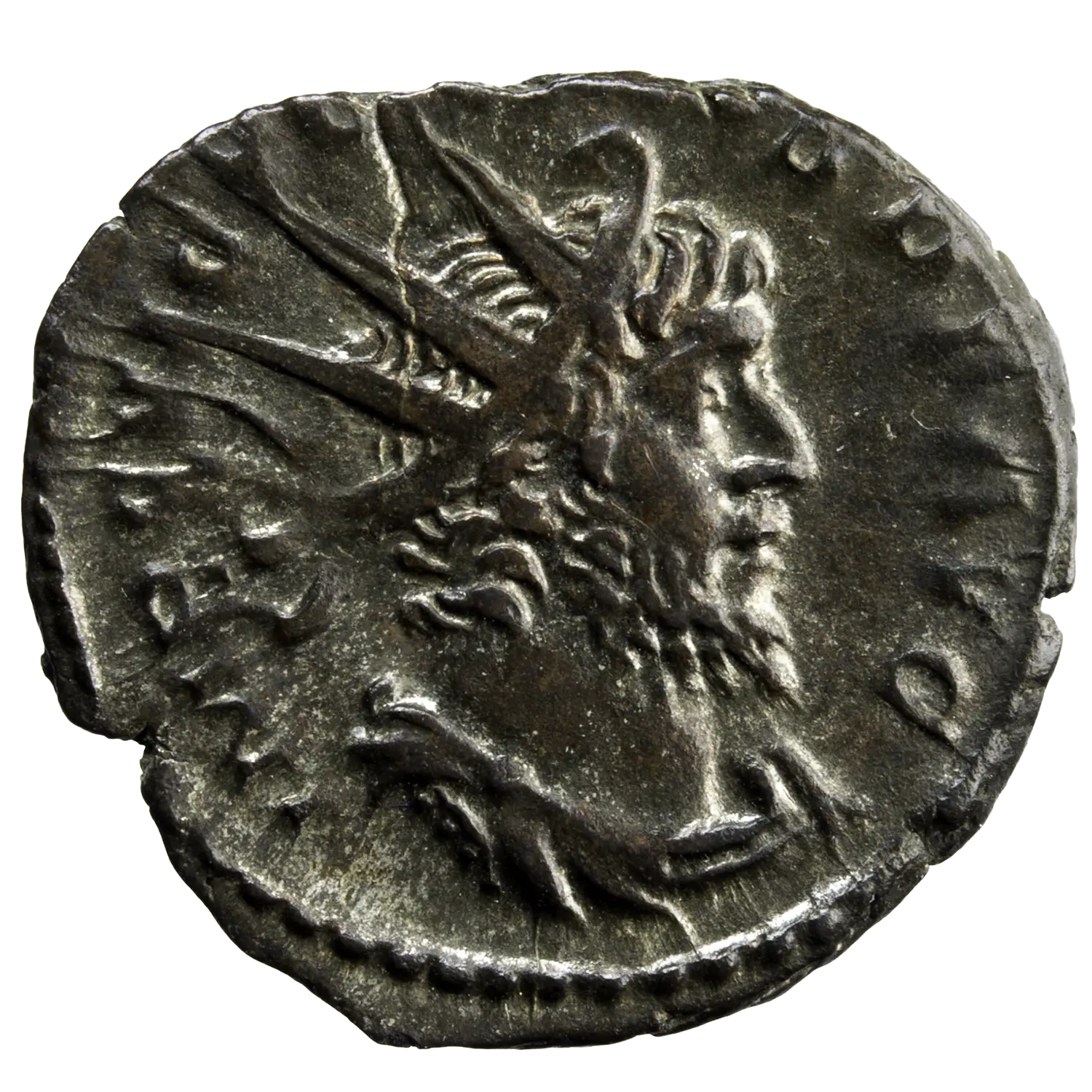Antoninien de Billon de l’empereur romain Victorin, monnaie frappée à Treves en 270. La paix debout un V à gauche et une étoile (✱) à droite