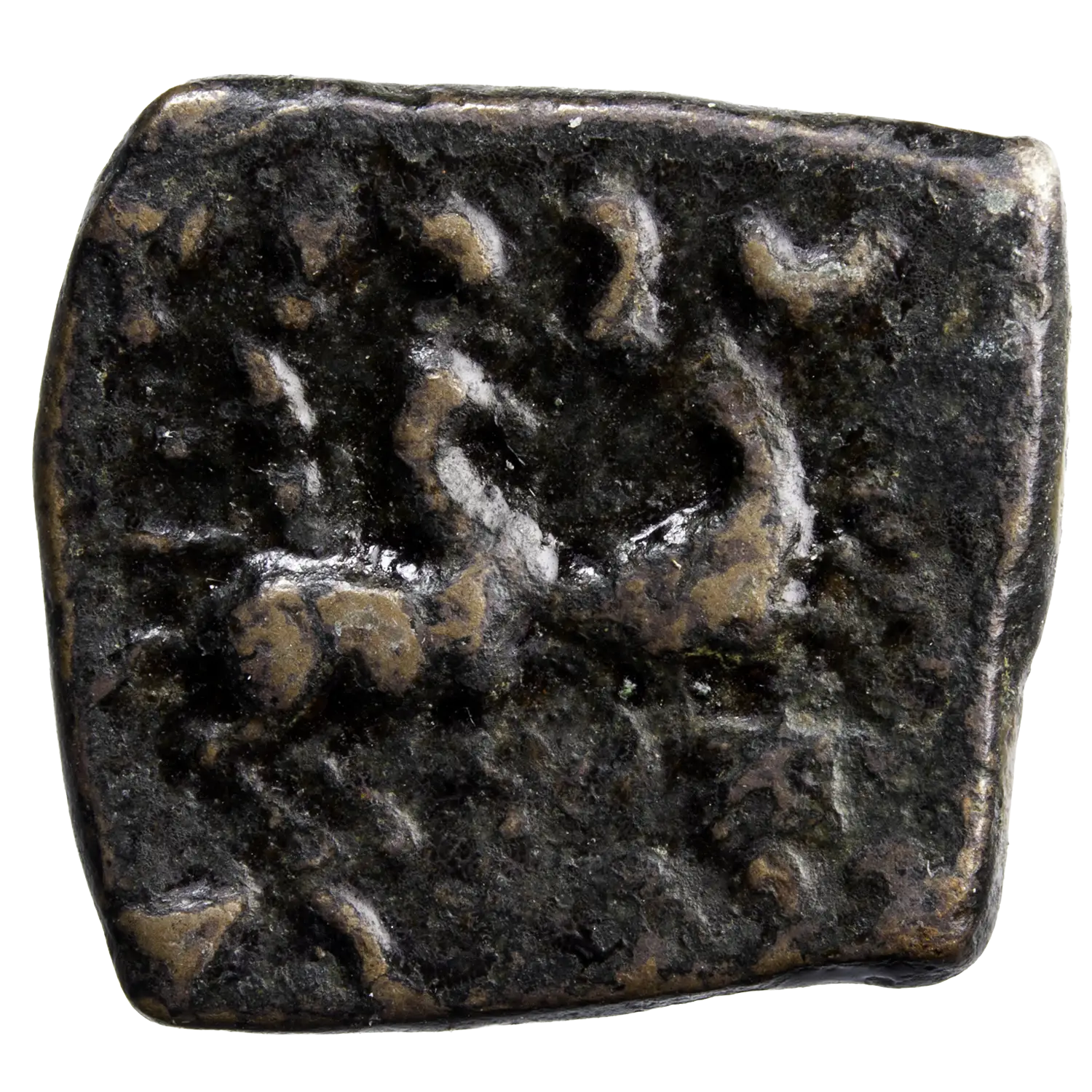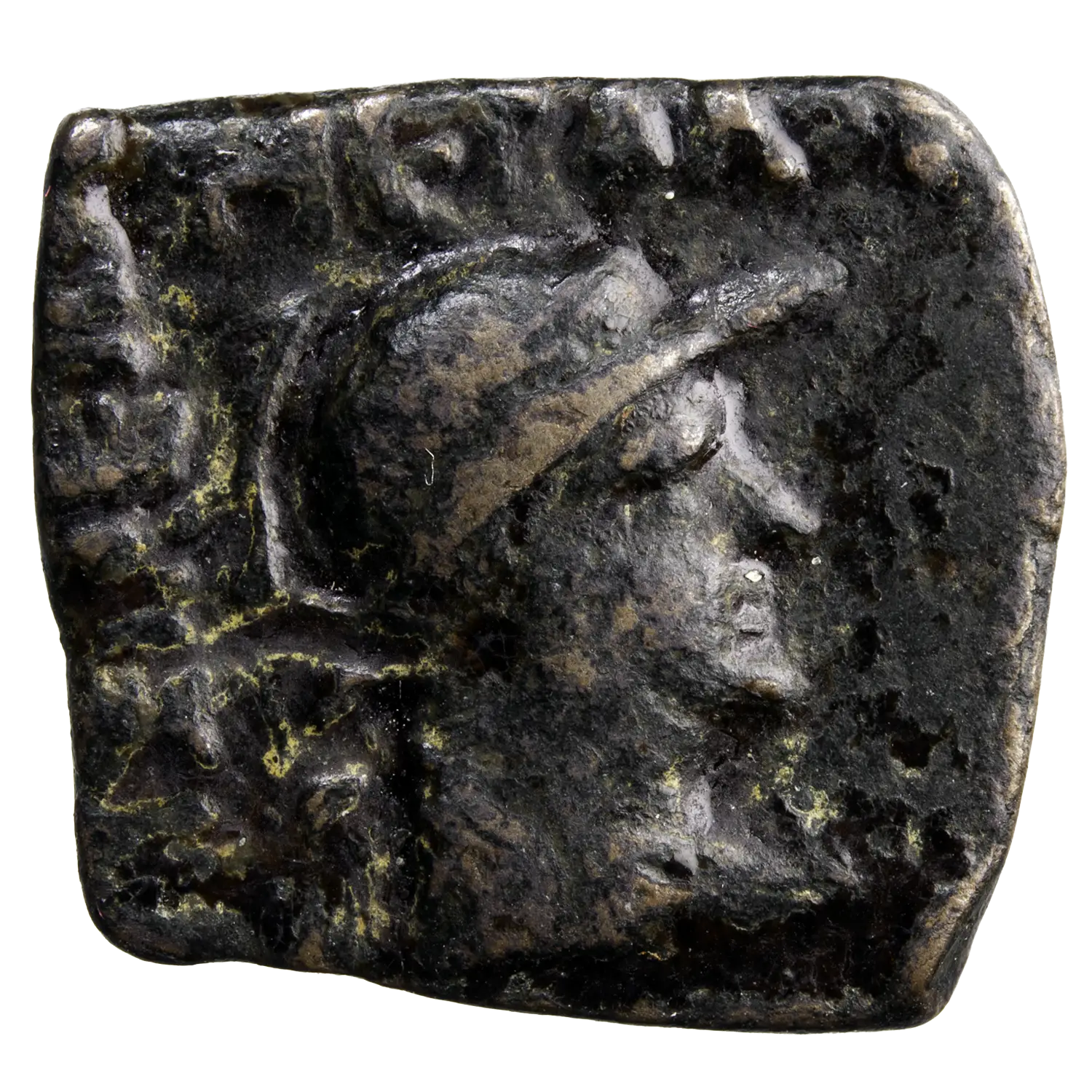 Bronze de forme carré frappé sous Eukratide I Megas roi Greco-Bactrien, monnaie frappée vers 170-145 avant JC en Bactriane. Tête casqué d’Eukratide à l’avers et les Dioscures au revers.