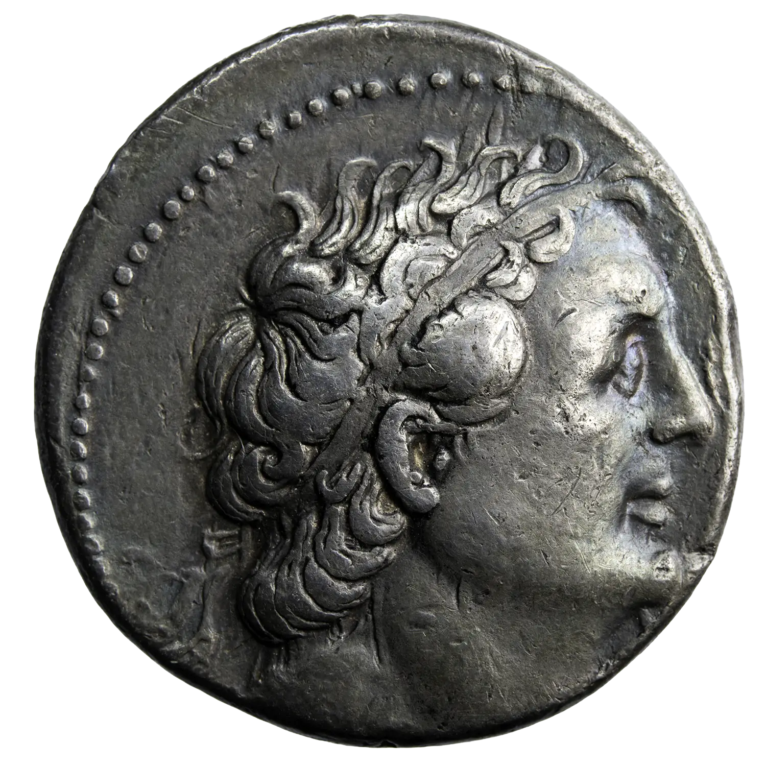 Tétradrachme en argent frappé sous Ptolémée II, roi d’Égypte, vers 256–255 av. J.-C., dans l’atelier de Tyr, en Phénicie.