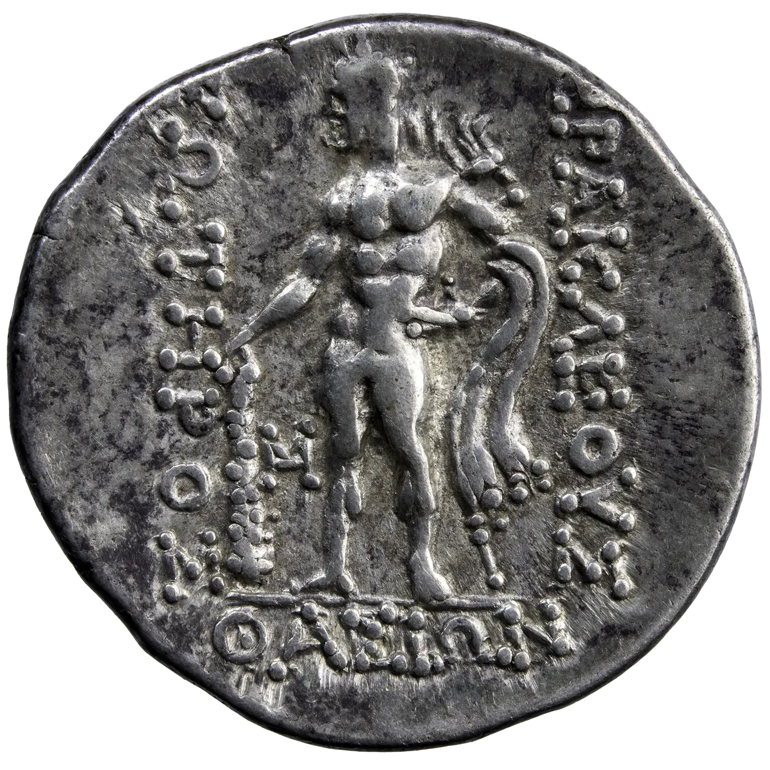 Célèbre tetradrachme en argent frappé à Thasos vers 148-80 avant JC. L’avers représente un portrait de Dionysos couronné de lierre, le revers représente Hercule avec la légende HΡAKΛEOΥΣ – ΣΩTHΡOΣ / ΘAΣIΩN.