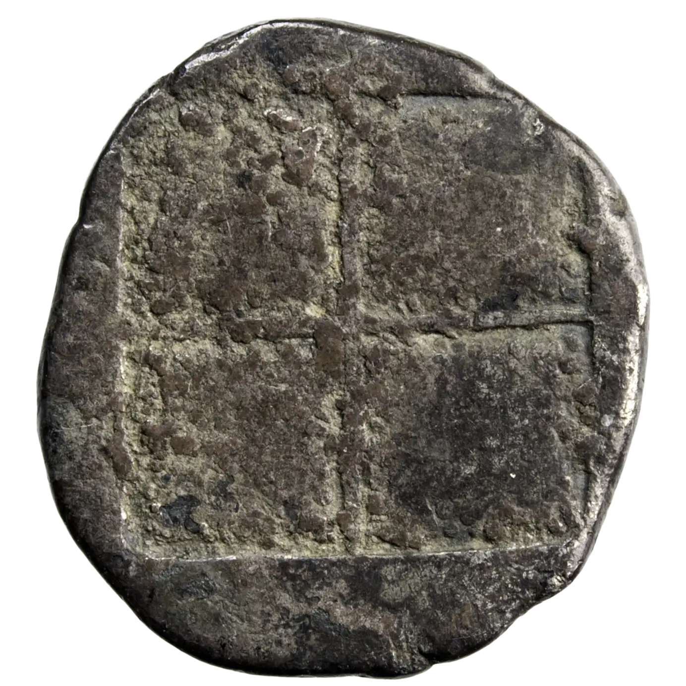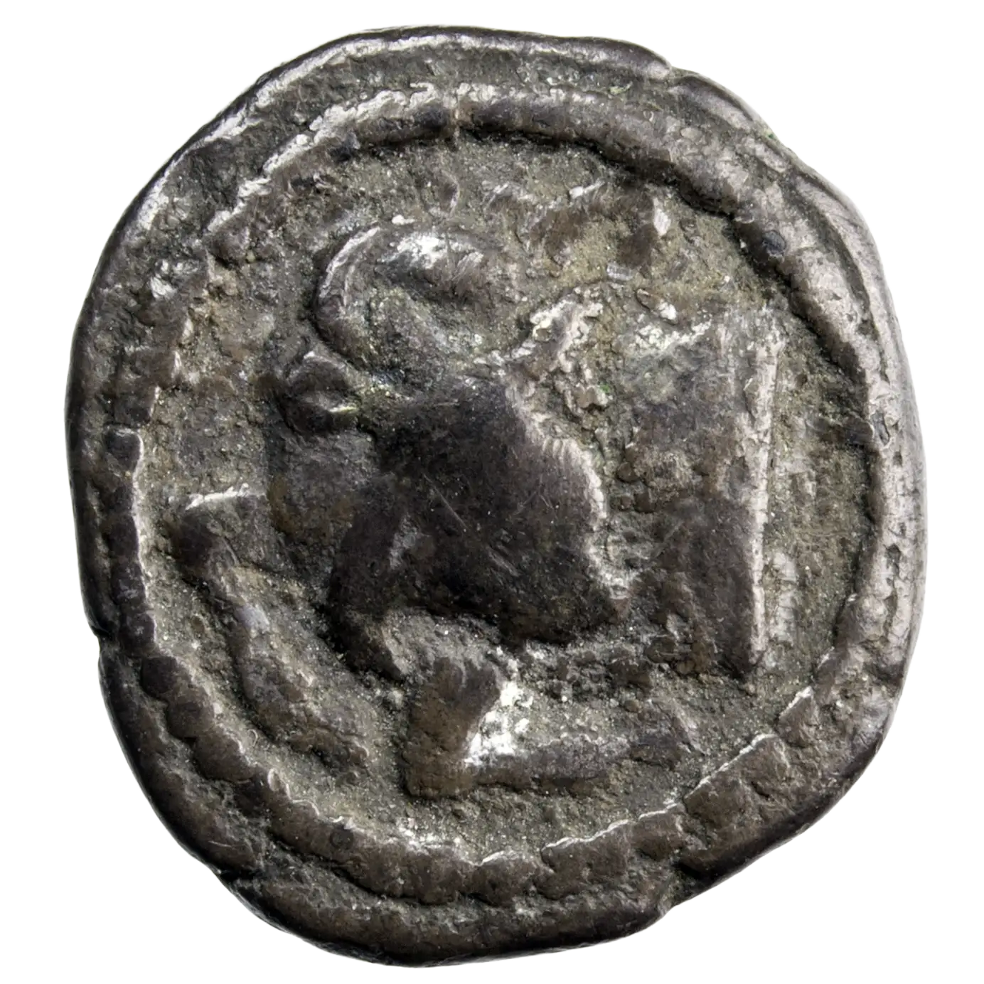 Tétrobole en argent frappé dans la ville d’Acanthe en Macédoine, monnaie frappée vers 424-380 avant JC. Taureau la tête tournée vers l’arrière.