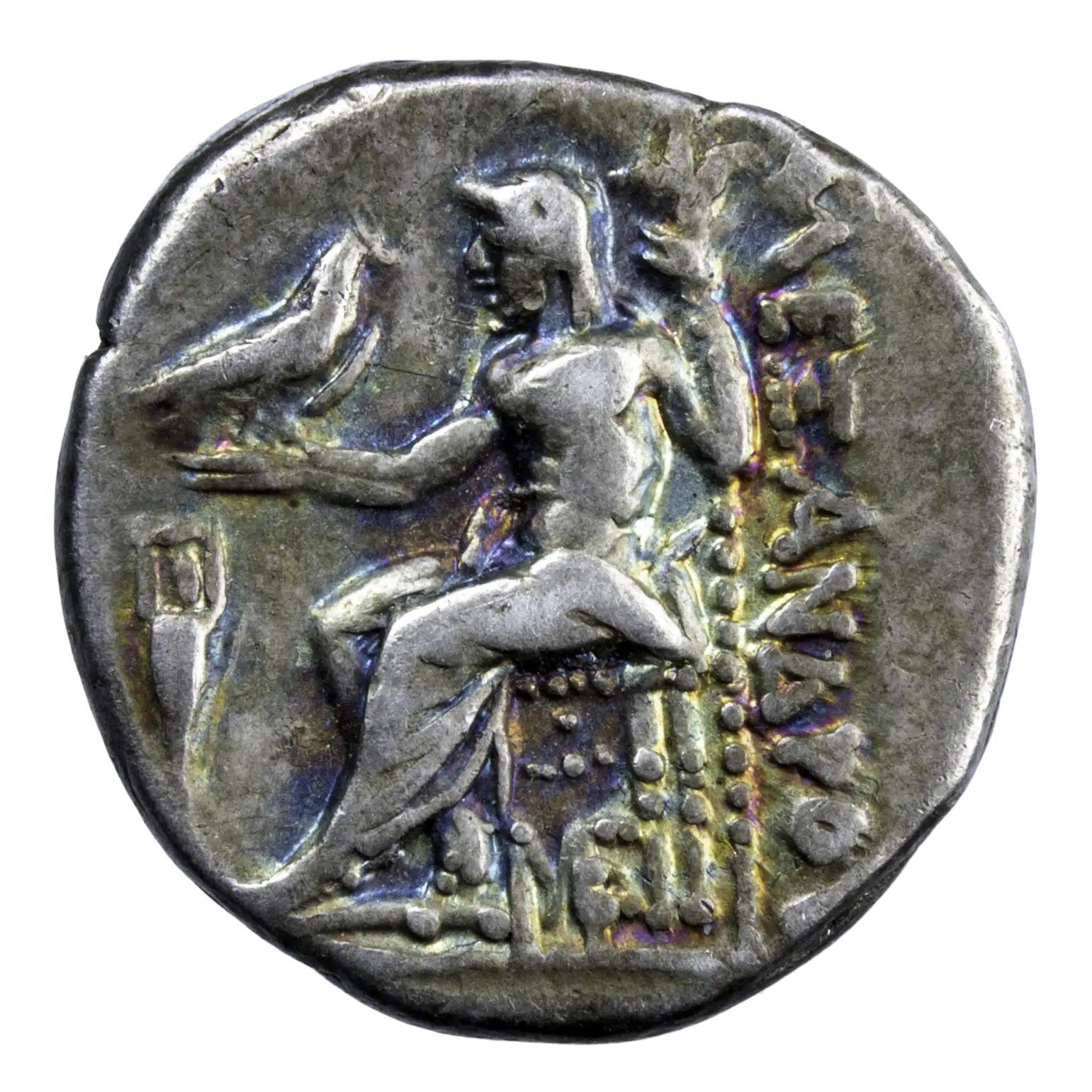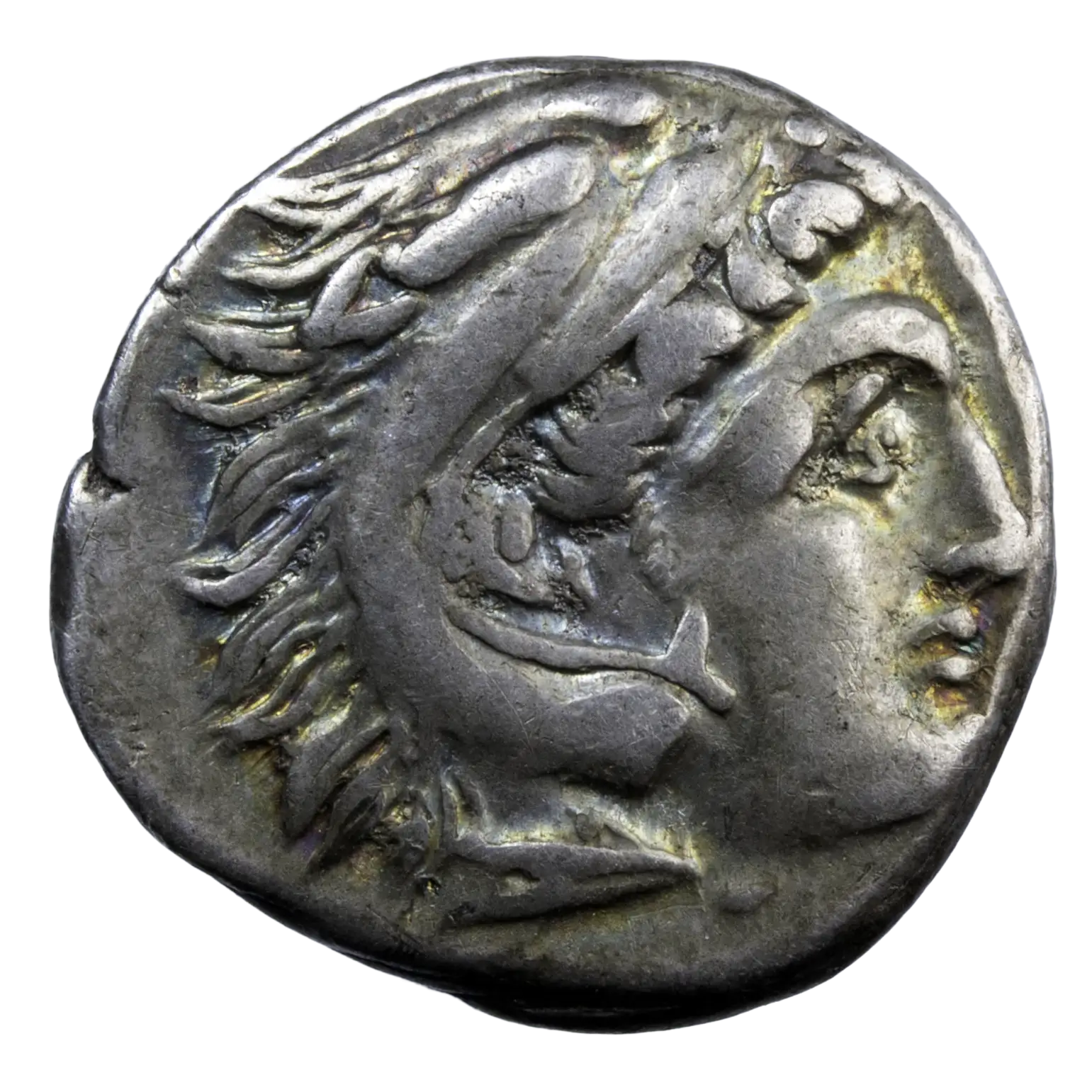 Drachme en argent frappée sous Antigonos I Monophthalmos stratège d’Asie (320-205) puis roi de 306-301 avant JC. Au type et à la légende d’Alexandre le grand. Monnaie frappée à Lampsaque. Jolie patine
