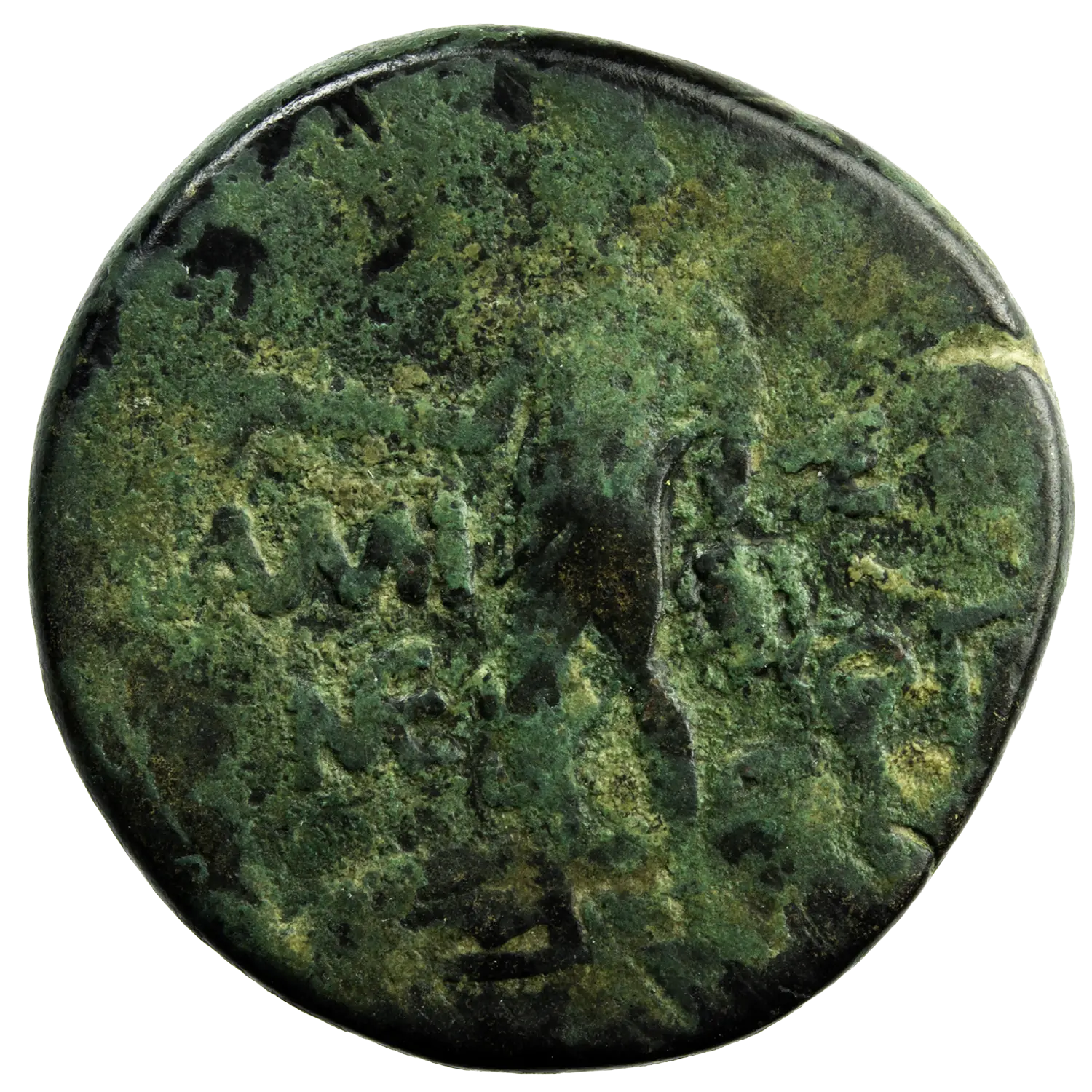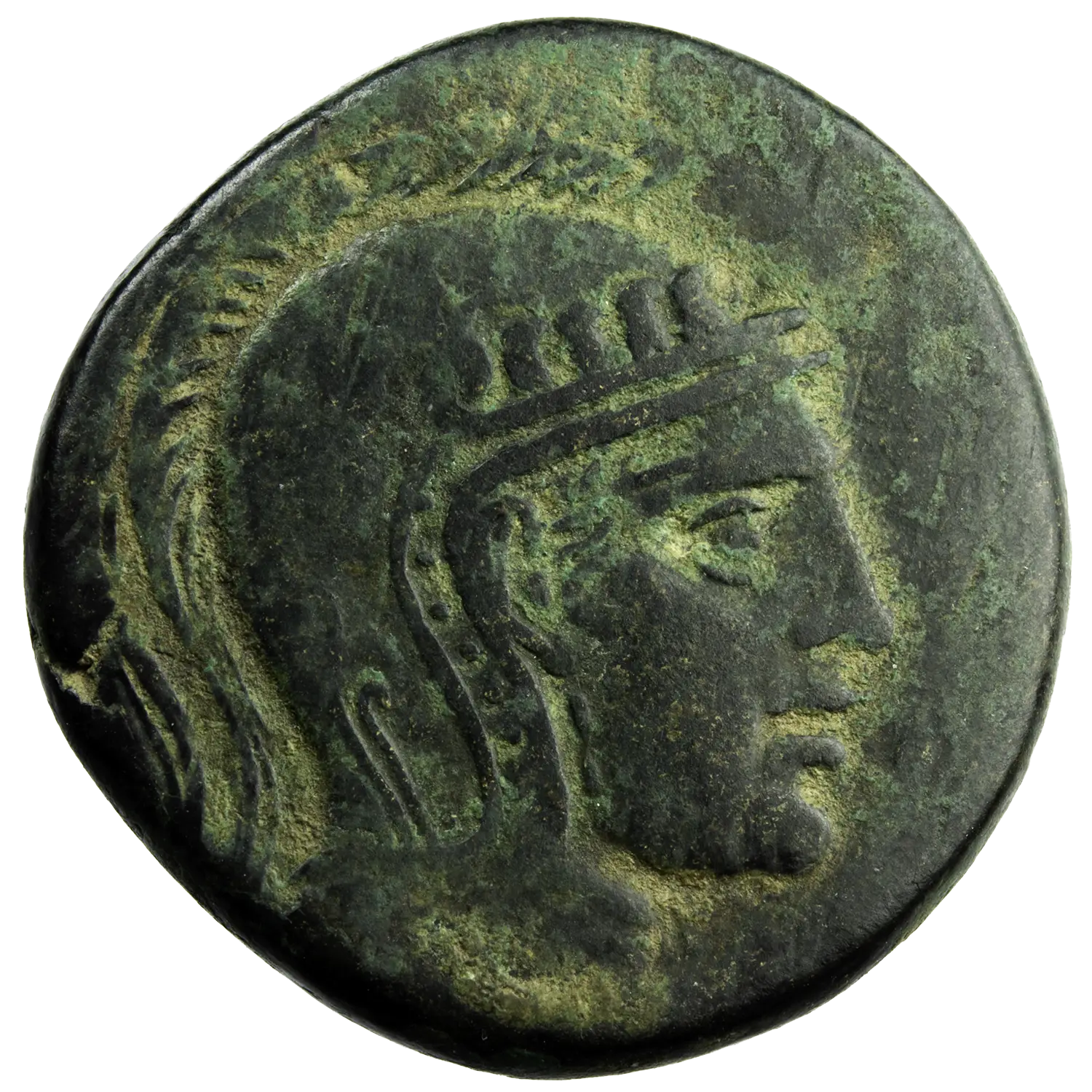 Monnaie en bronze frappée pour le royaume du Pont à Amisos sous Mithridates VI, monnaie frappée vers 105-90 avant JC. Tête d’Athena casqué à l’avers