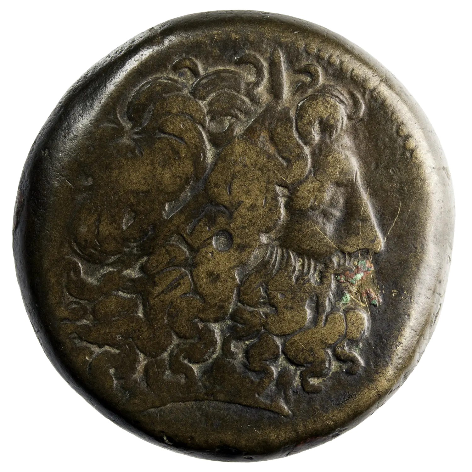 Tetrobole en bronze de Ptolémée III Evergète roi d’Egypte de la dynastie des Lagides. Grande monnaie en bronze frappée vers 246-222 avant JC à Alexandrie.