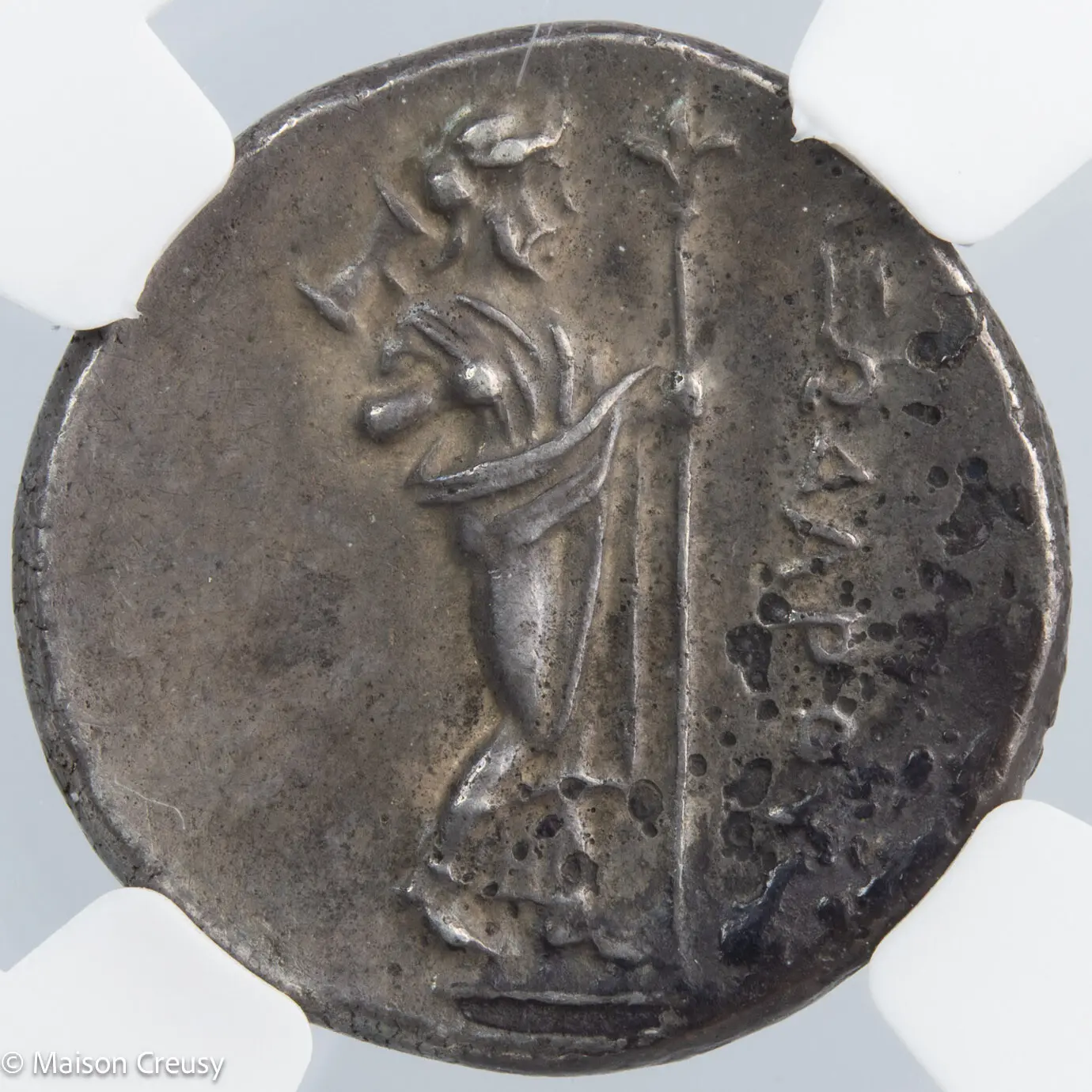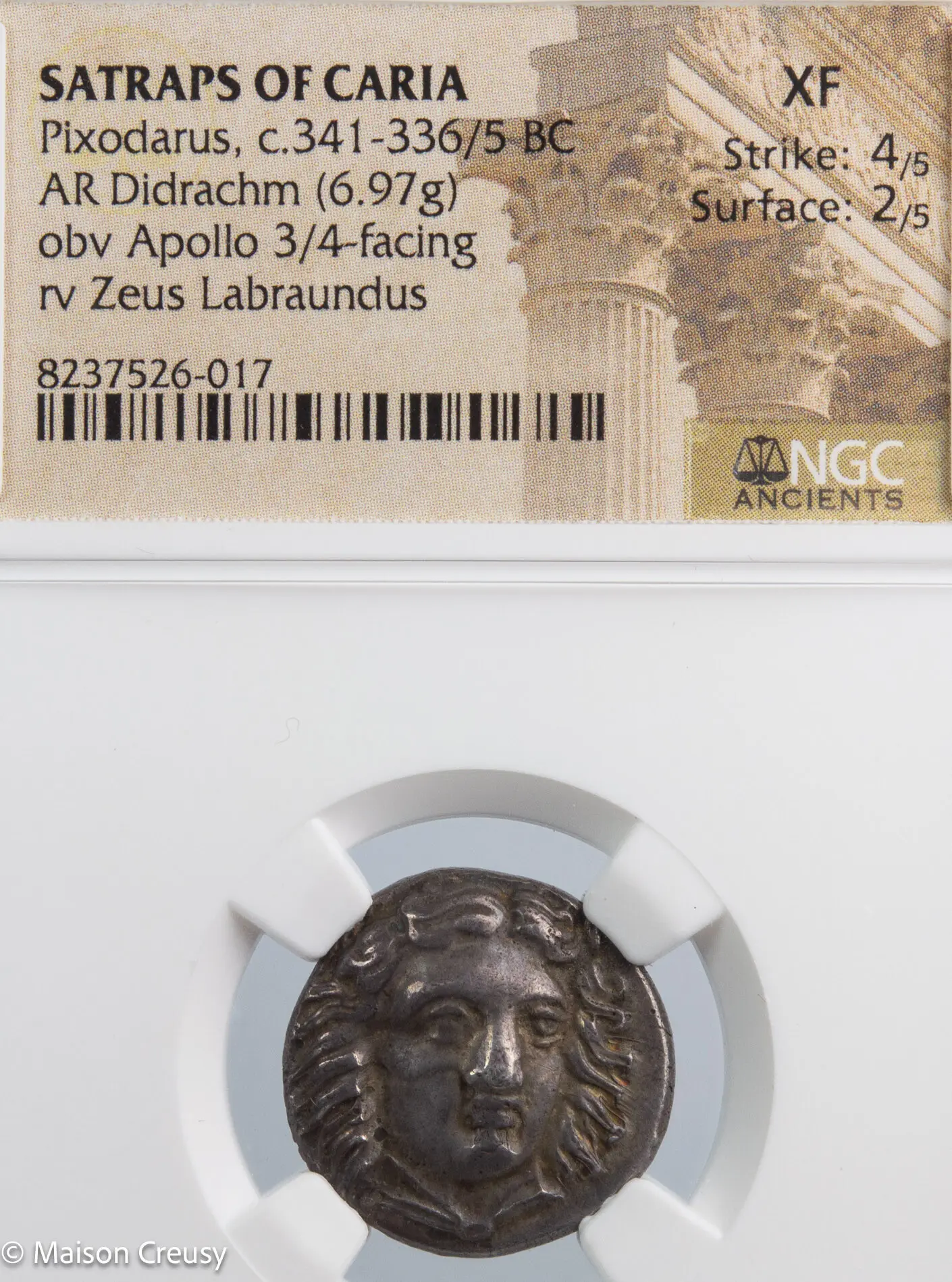 Le didrachme frappé sous le magistrat Pixodaros (vers 340-334 av. J.-C.) à Halicarnasse, en Carie, s’inscrit dans une période charnière de l’histoire de l’Asie Mineure. Fils d’Hécatomnos et frère de Mausole, Pixodaros appartient à la dynastie des Hékatomnides, vassale de l’Empire perse mais fortement marquée par l’influence grecque. Son règne, marqué par une habile politique d’alliances, correspond à la fin de la domination achéménide en Asie Mineure, juste avant les campagnes d’Alexandre le Grand. La monnaie illustre cette double identité culturelle, mêlant références grecques et pouvoir dynastique local, et témoigne du rôle stratégique de Halicarnasse au carrefour des mondes grec et oriental.