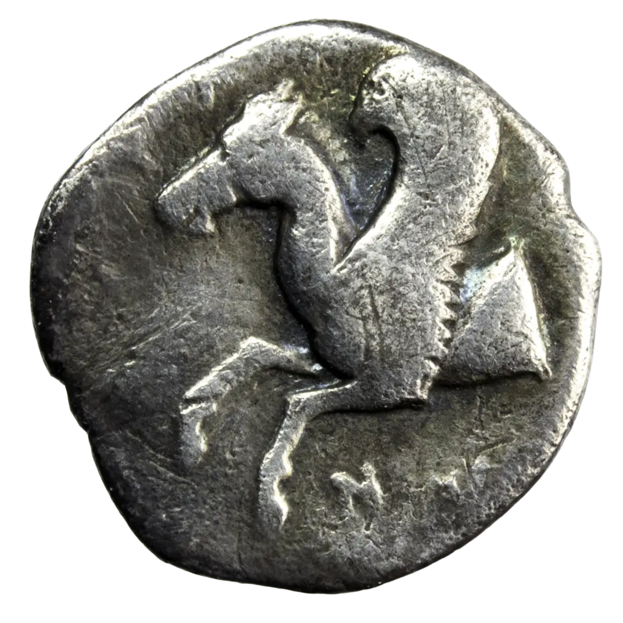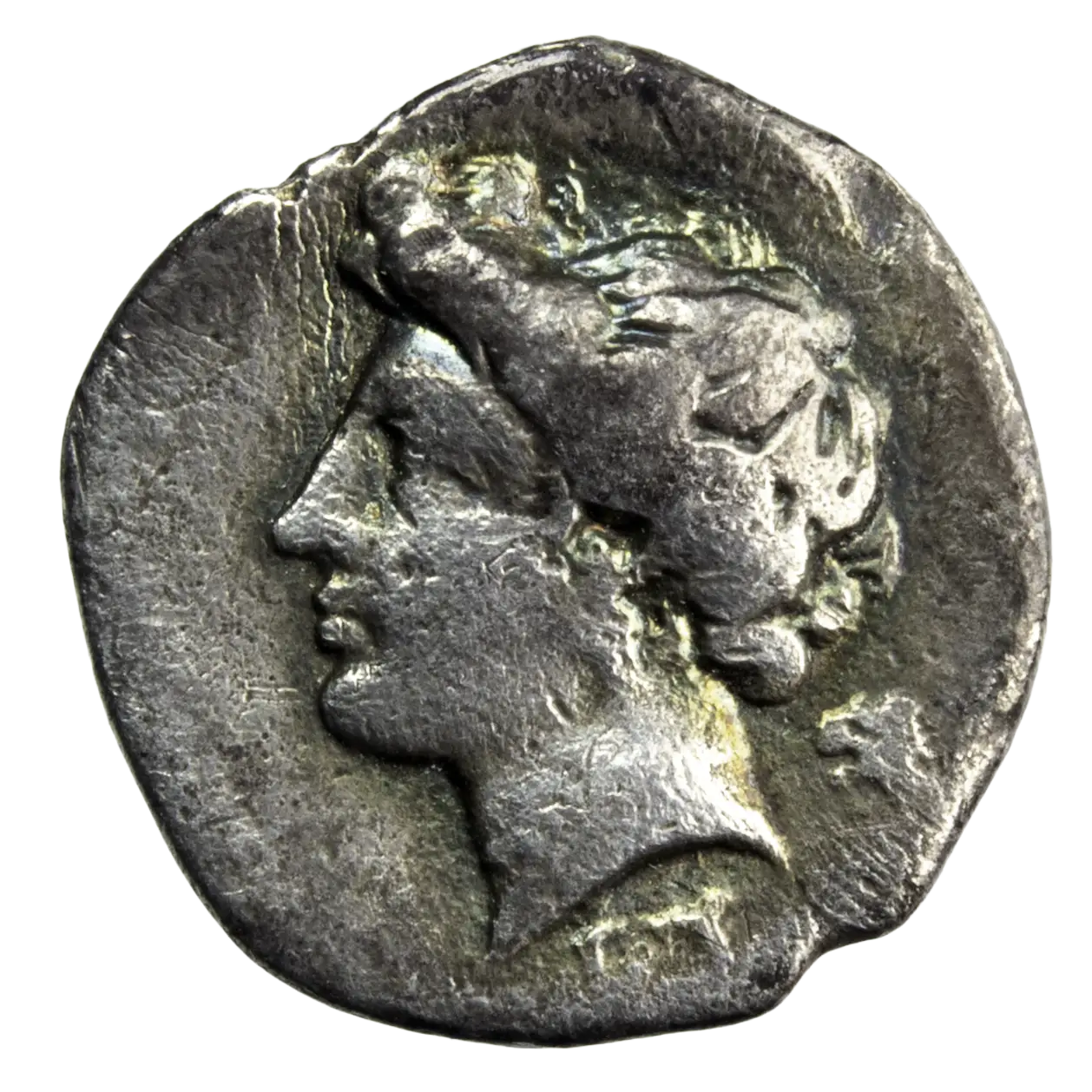 Rare hemidrachme de Syracuse, monnaie frappée vers 343-317 avant JC. Tête féminine à l’avers derrière un tête de lion, dessous EY. Le revers représente un protomée de Pégase avec autour la légende ΣVRAKOΣION. R2 dans le Hoover