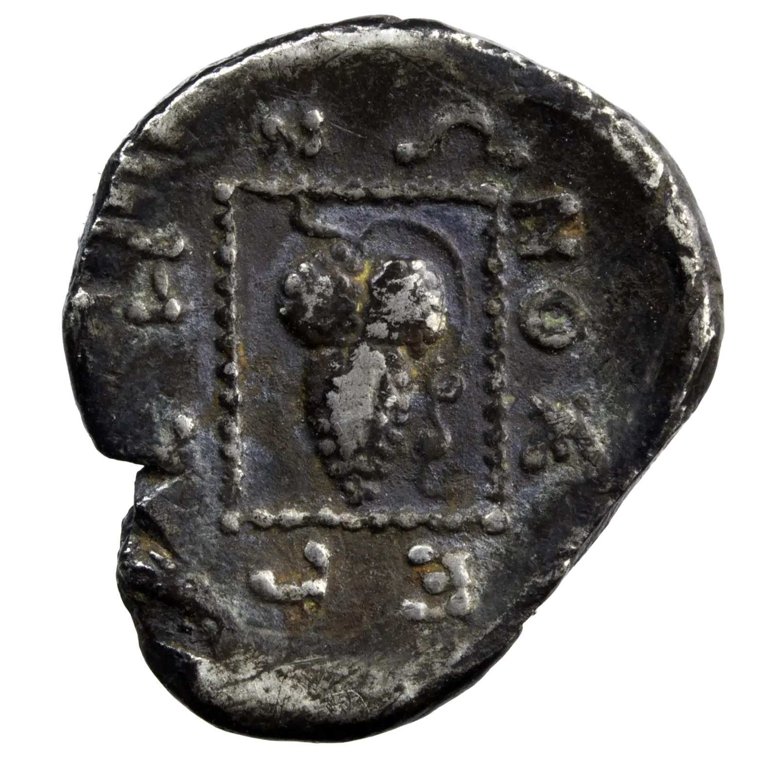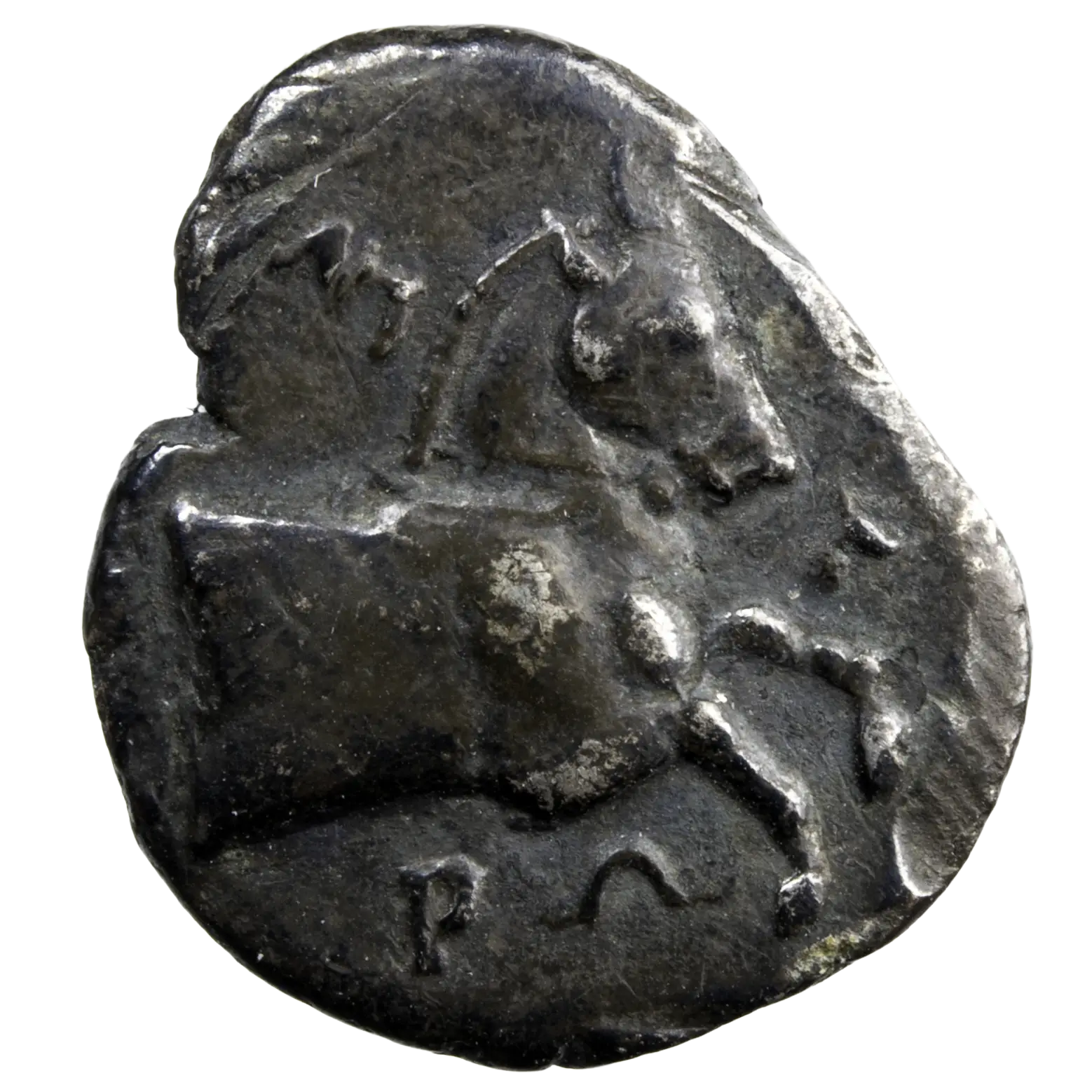 Triobole en argent frappée pour la ville de Maronée en Thrace vers 386-348 avant JC. D’après la légende la ville fut fondée par Maron fils de Dyonisos.