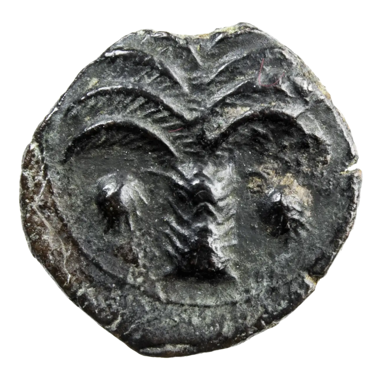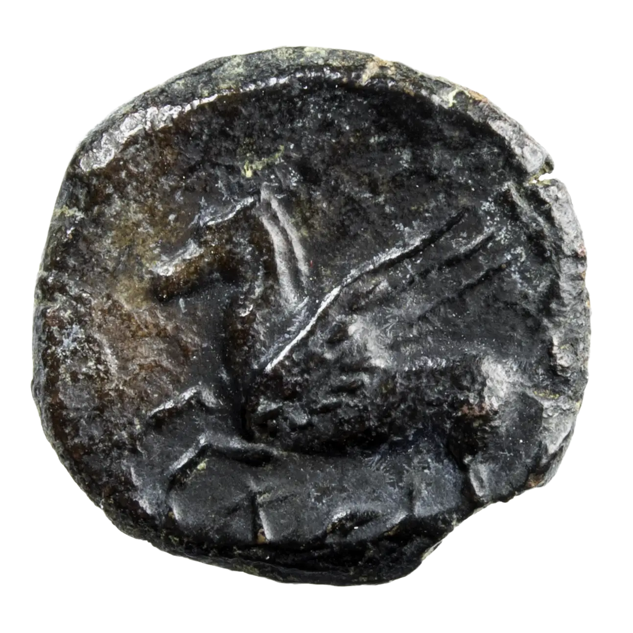 Petit bronze de Carthage frappée dans un atelier non déterminé en Sicile vers 330-320 avant JC. Palmier à l’avers et Pégase au revers.
