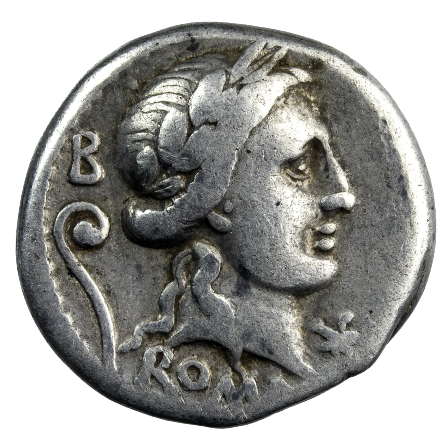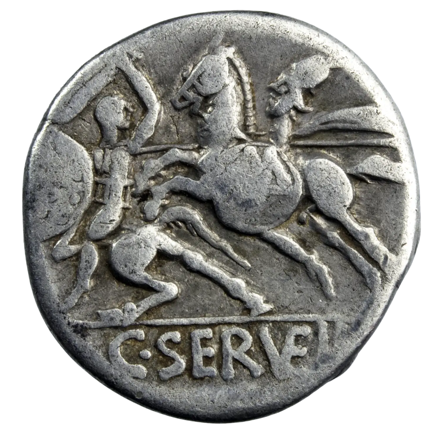 Denier de la république romaine frappé par le monétaire C. Servilius Vatia de la famille Servilia. Tête d’Apollon avec une ✱ sous le menton à l’avers et Cavalier galopant à gauche un autre cavalier au sol tenant un bouclier.