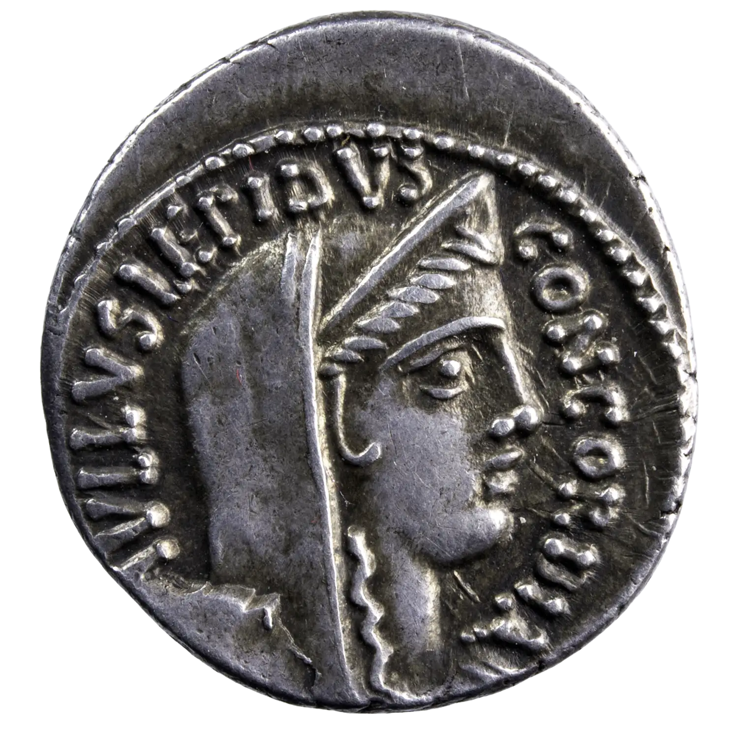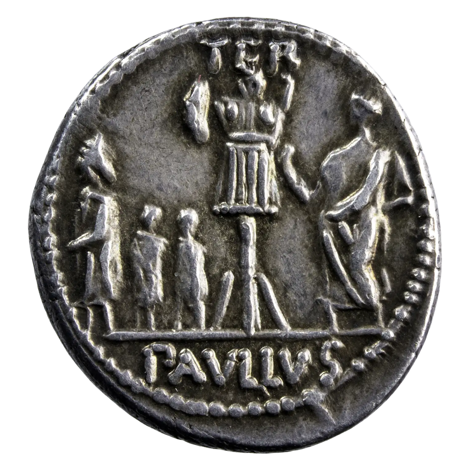 Denier en argent de la République romaine, de la gens Aemilia, frappé à Rome en 62 av. J.-C. par le monétaire L. Aemilius Lepidus Paullus, avec tête voilée de la Concorde à l’avers et, au revers, Aemilius à droite d’un trophée, face à Persée, roi de Macédoine, et ses deux fils attachés.