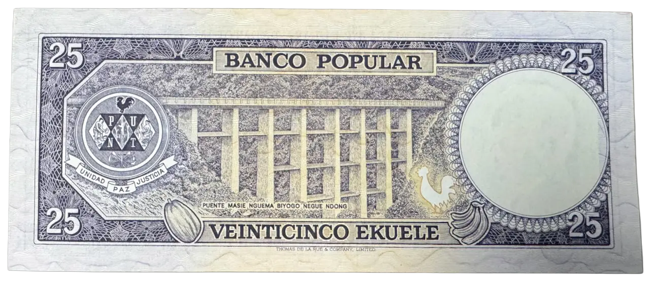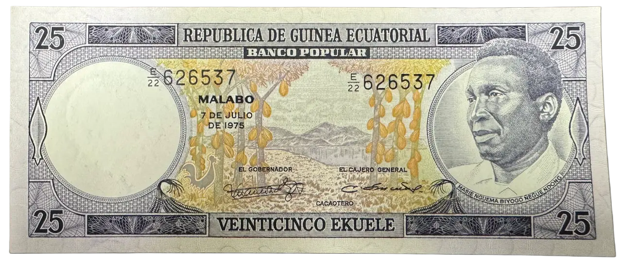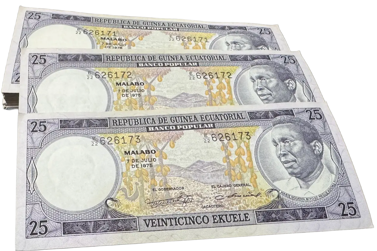 Liasse de 89 billets de la république de Guinée équatoriale daté du 7 juillet 1975. Billet imprimé à Londres