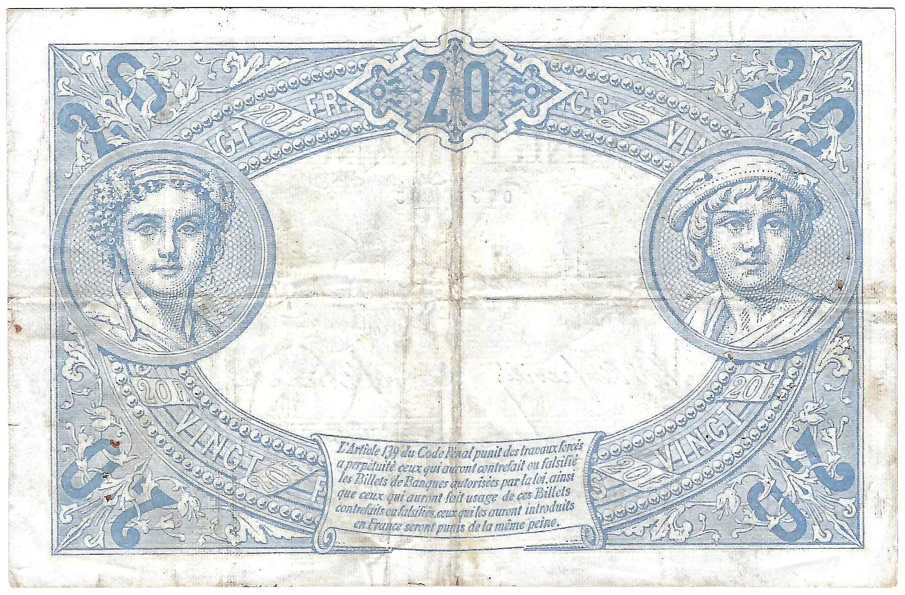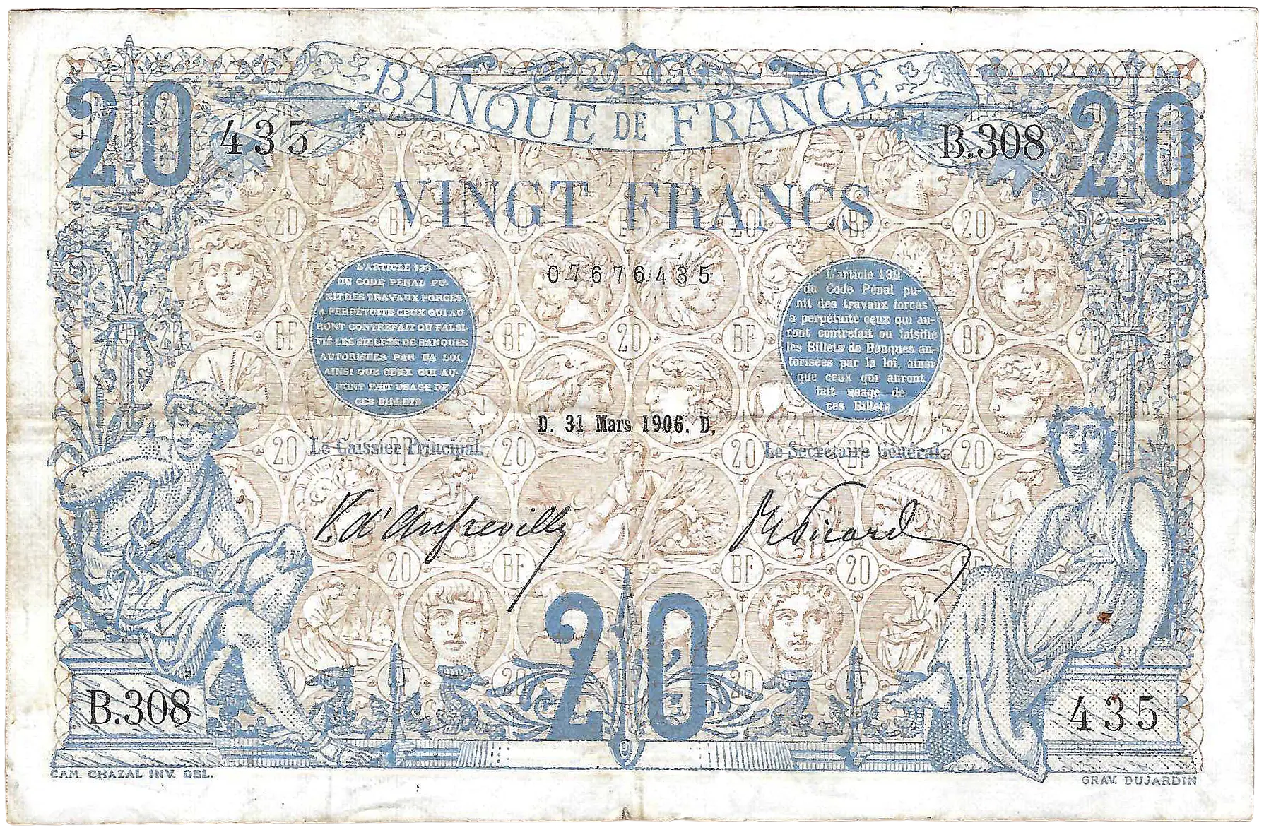 Billet de la banque de France de 20 francs Bleu daté du D.31 mars 1906.D Alphabet B.308 / 435 / 07676435. Trace de pliures et épinglages