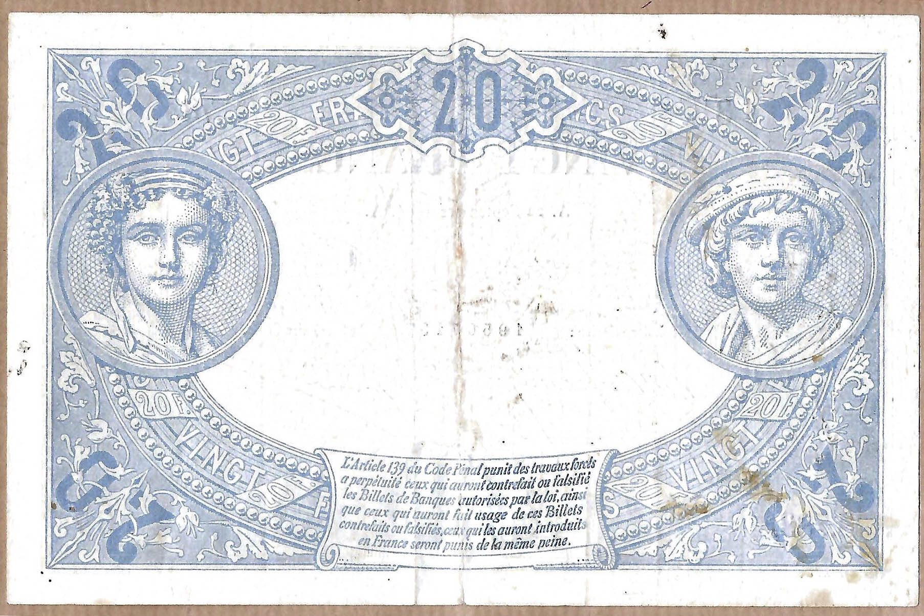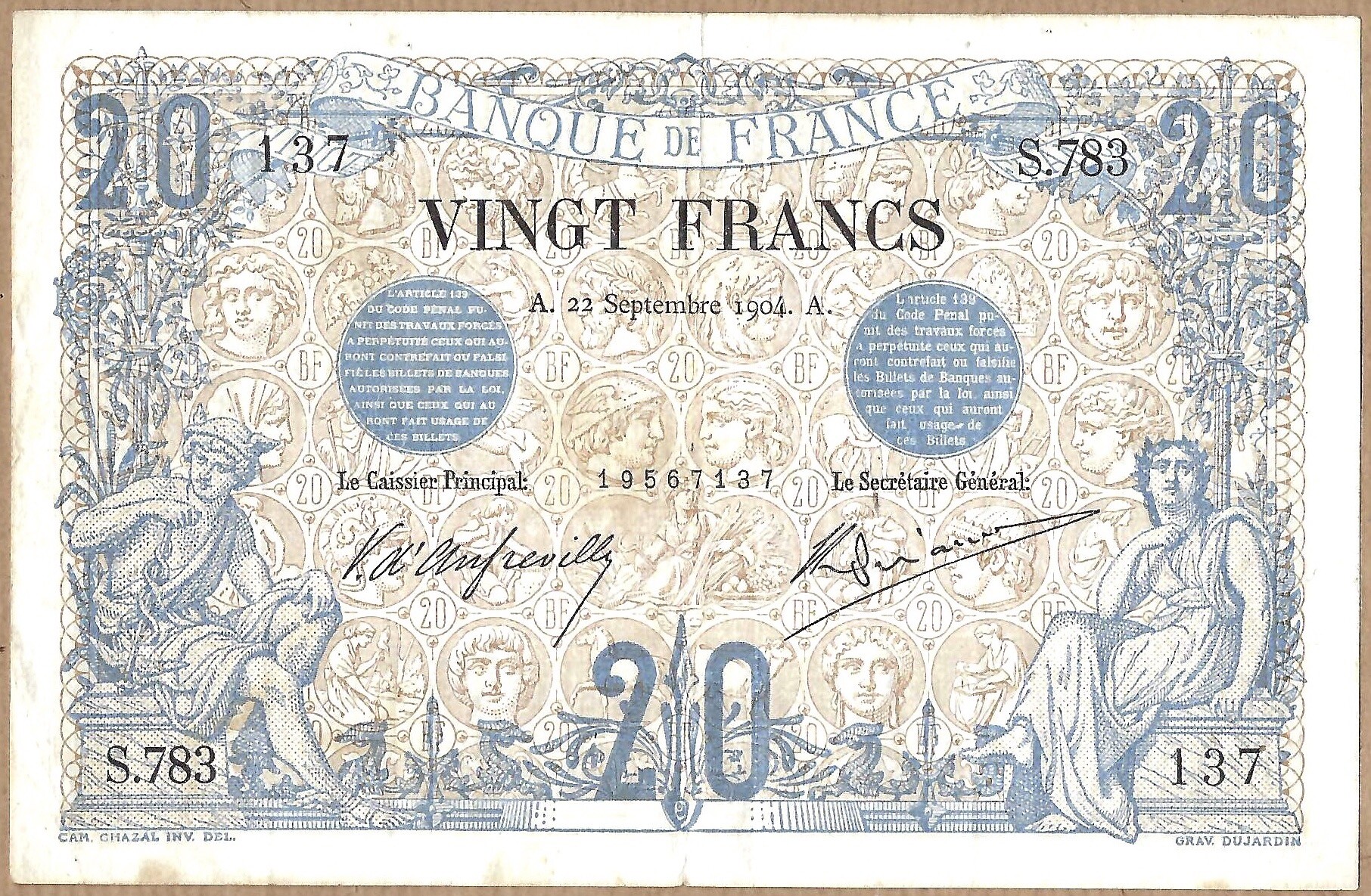 Billet de 20 francs noir du A.22 Septembre 1904.A numéro 19567137, S.783