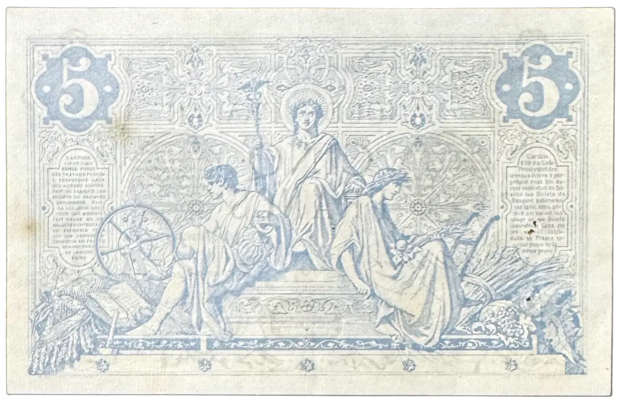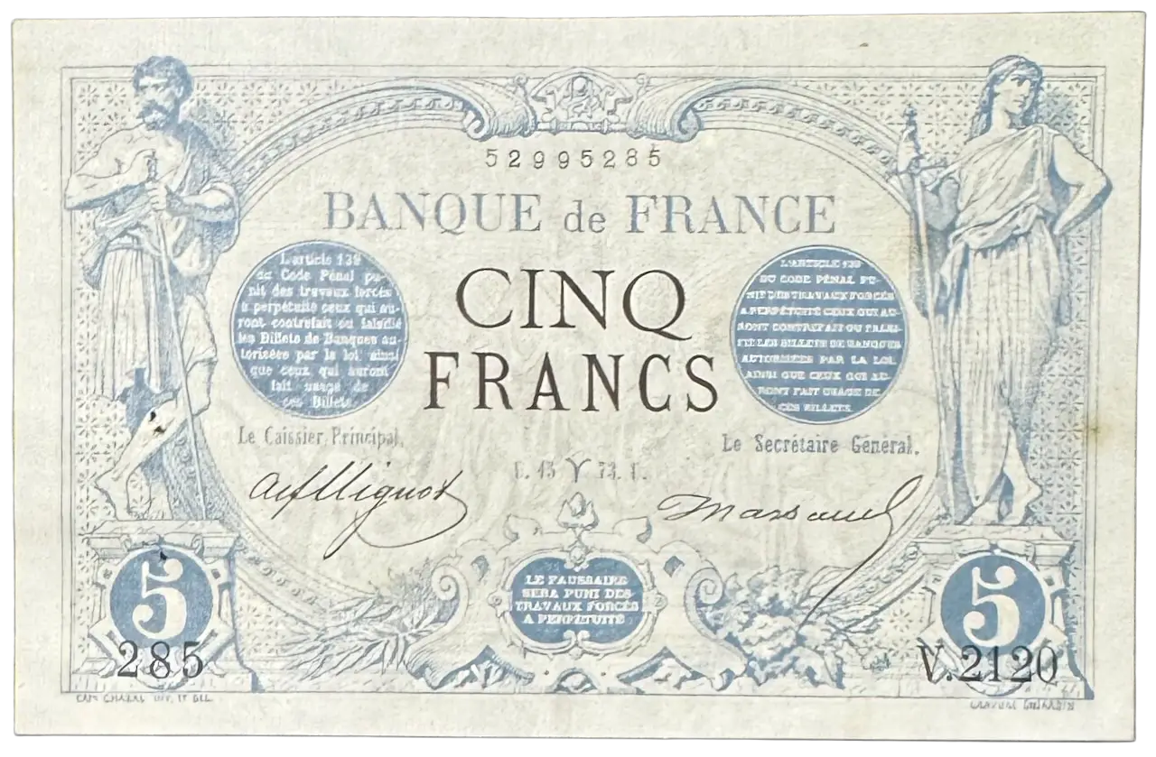 Billet de la banque de France, 5 francs noir type 1871 daté du 15 Mars 1873. V.2120 / 285 / 52995285