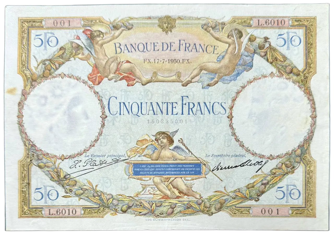 Billet de 50 francs de la banque de France type Luc Olivier Merson type 1927 . Billet daté FX.17-7-1930.FX. / L.6010 / 001 / 150235001