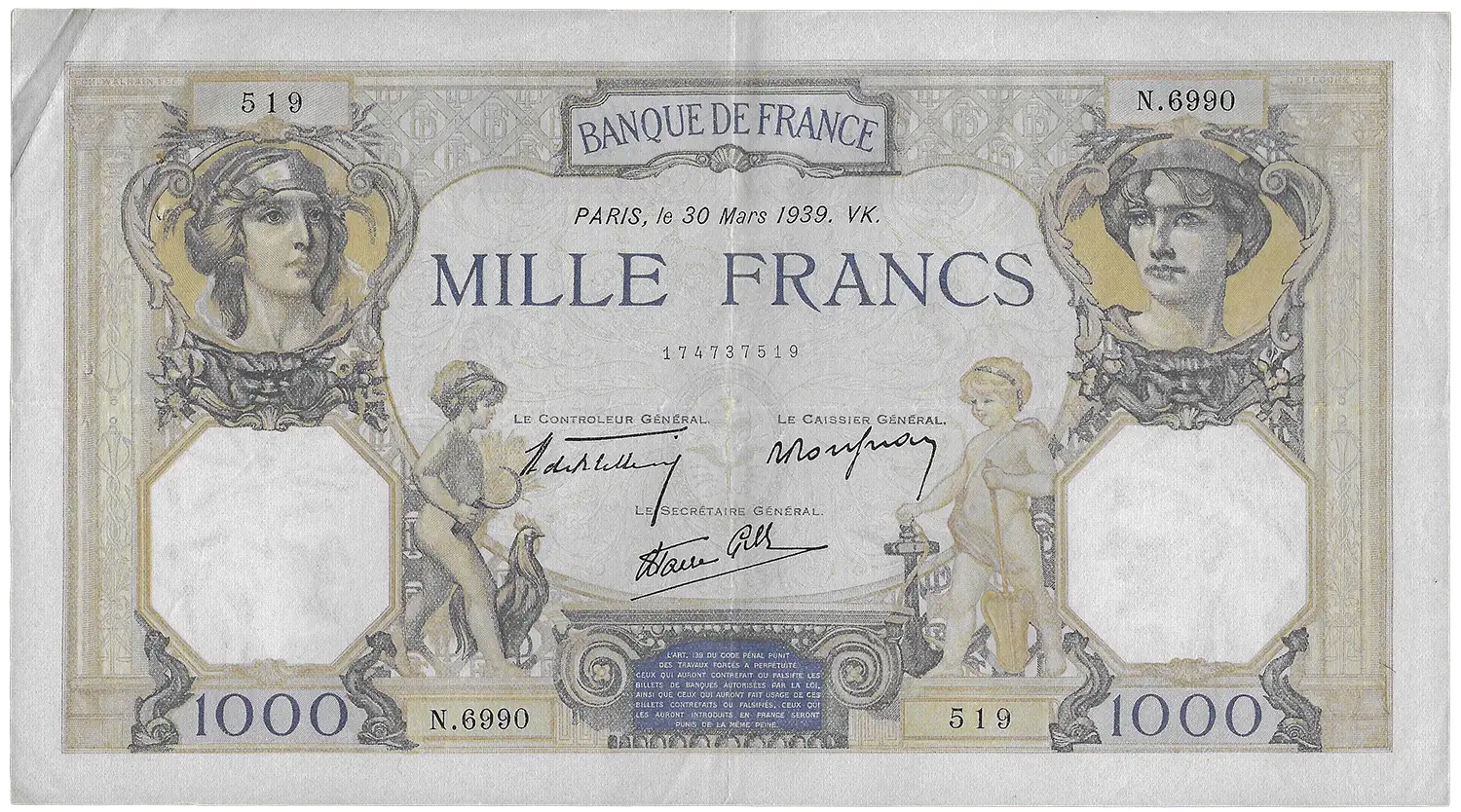 Billet de la banque de France de 1000 francs Ceres et Mercure du 30 mars 1939.VK N.6990 / 519. Trace de pliure mais jolie papier