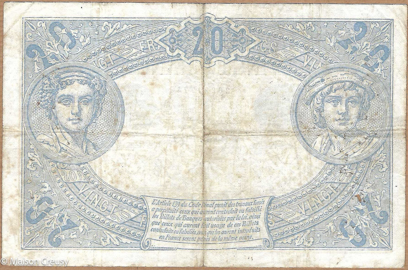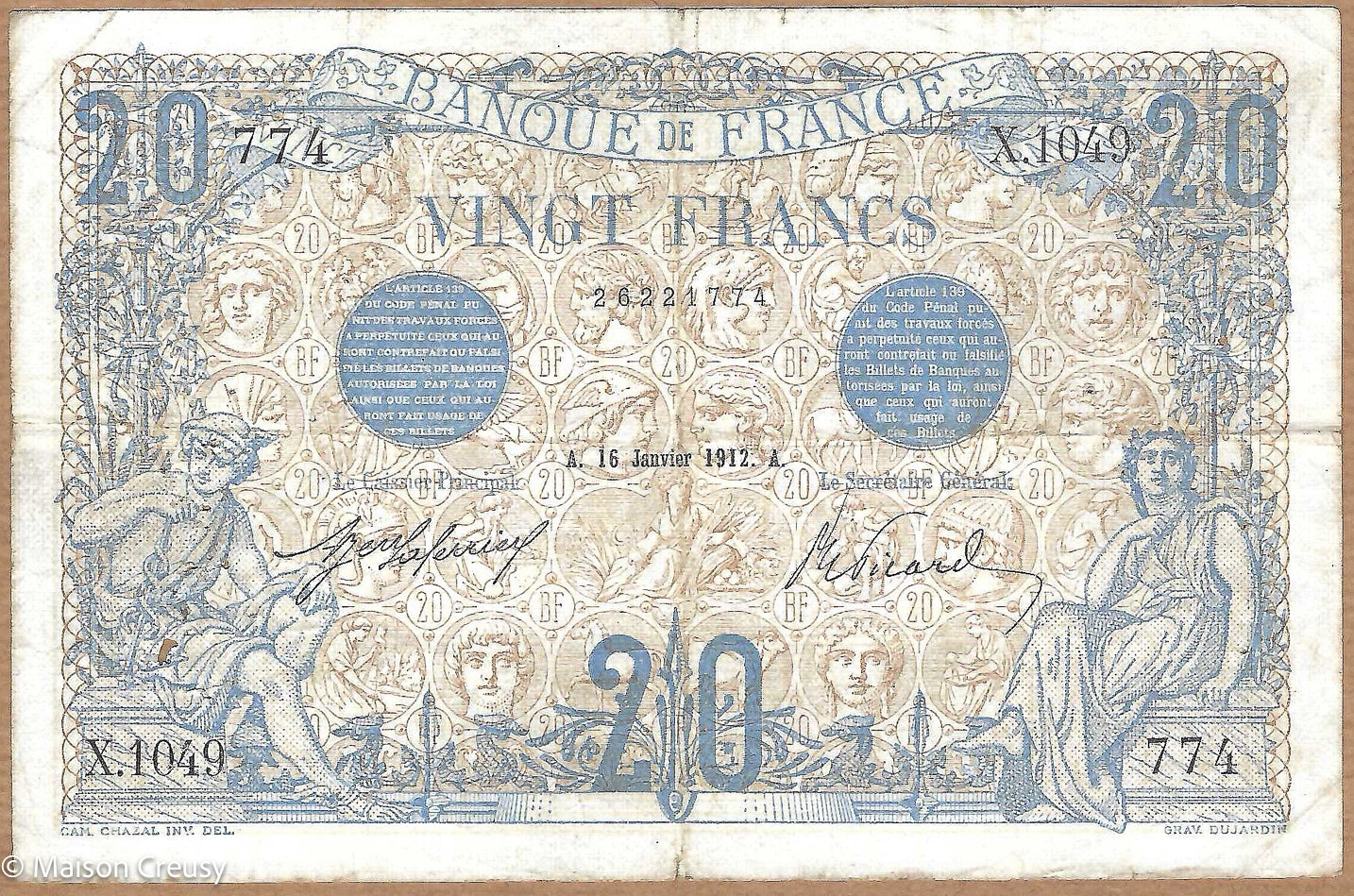 Billet 20 francs bleu de la Banque de France du 16 janvier 1912. X.1049 / 774 / A. 16 Janvier 1912. A. des trous et des pliures