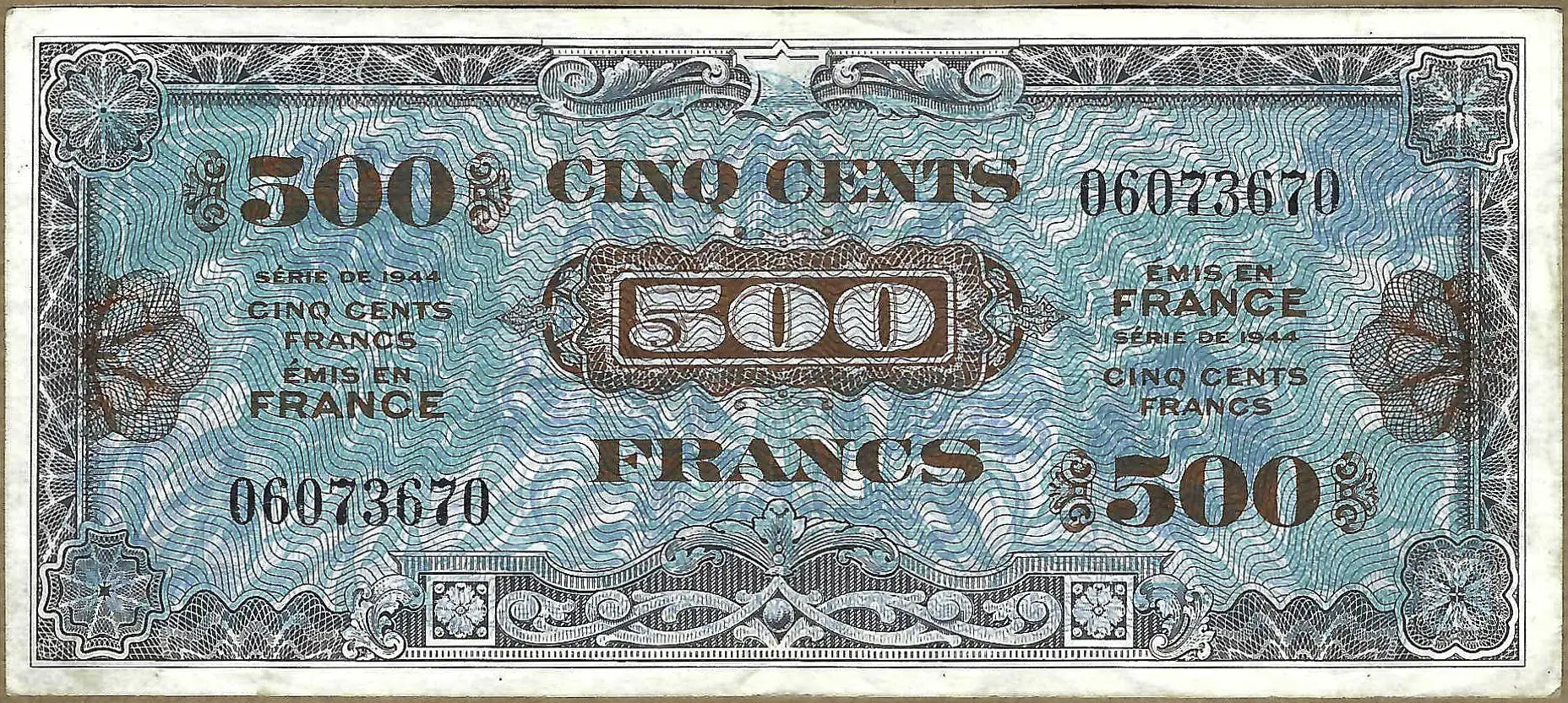 Le billet de 500 francs “Drapeau” type 1944 est un billet français émis à la fin de la Seconde Guerre mondiale. Il est créé pour être utilisé lors de la libération de la France et symbolise le retour de l’autorité française.