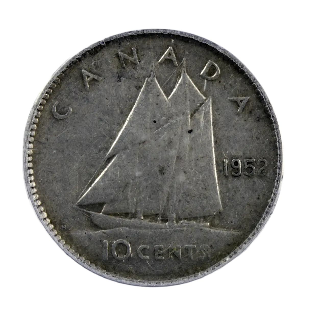Pièce en argent de 10 cents frappée sous Georges VI roi du Canada frappé à Ottawa en 1952. Certifiée par PCGS XF40. Le bateau Bluenose, une goélette de course légendaire