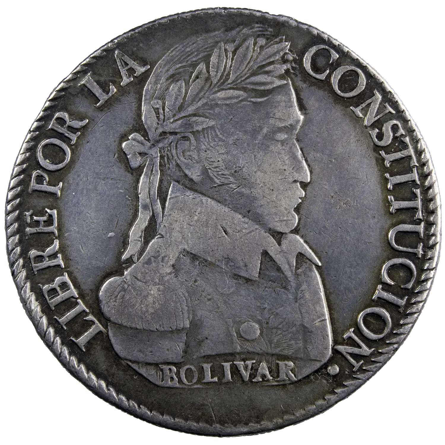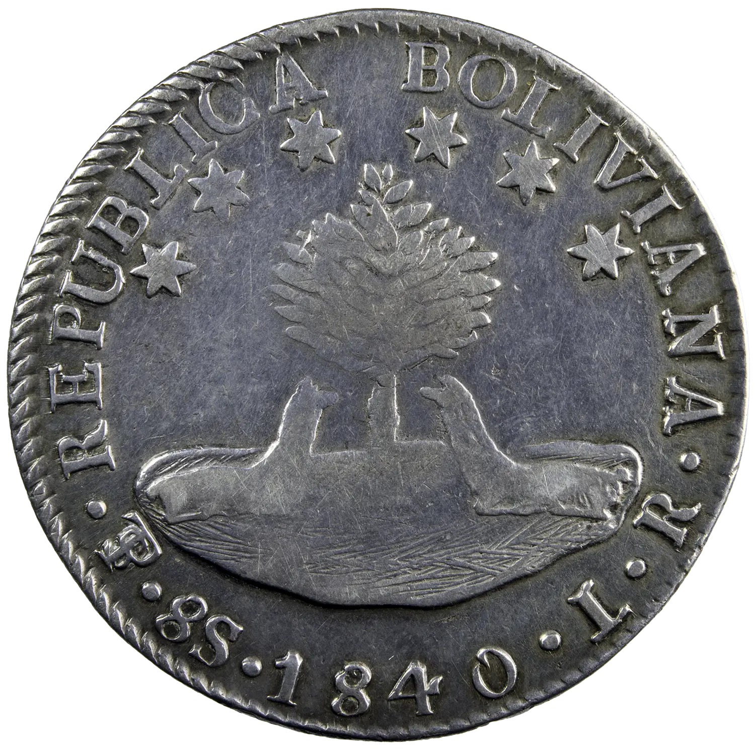 Pièce en argent pour la république de Bolivie, monnaie de 8 soles frappée en 1840 à Potosi petite trace sur la tranche. Deux lamas couchés devant un arbre au revers