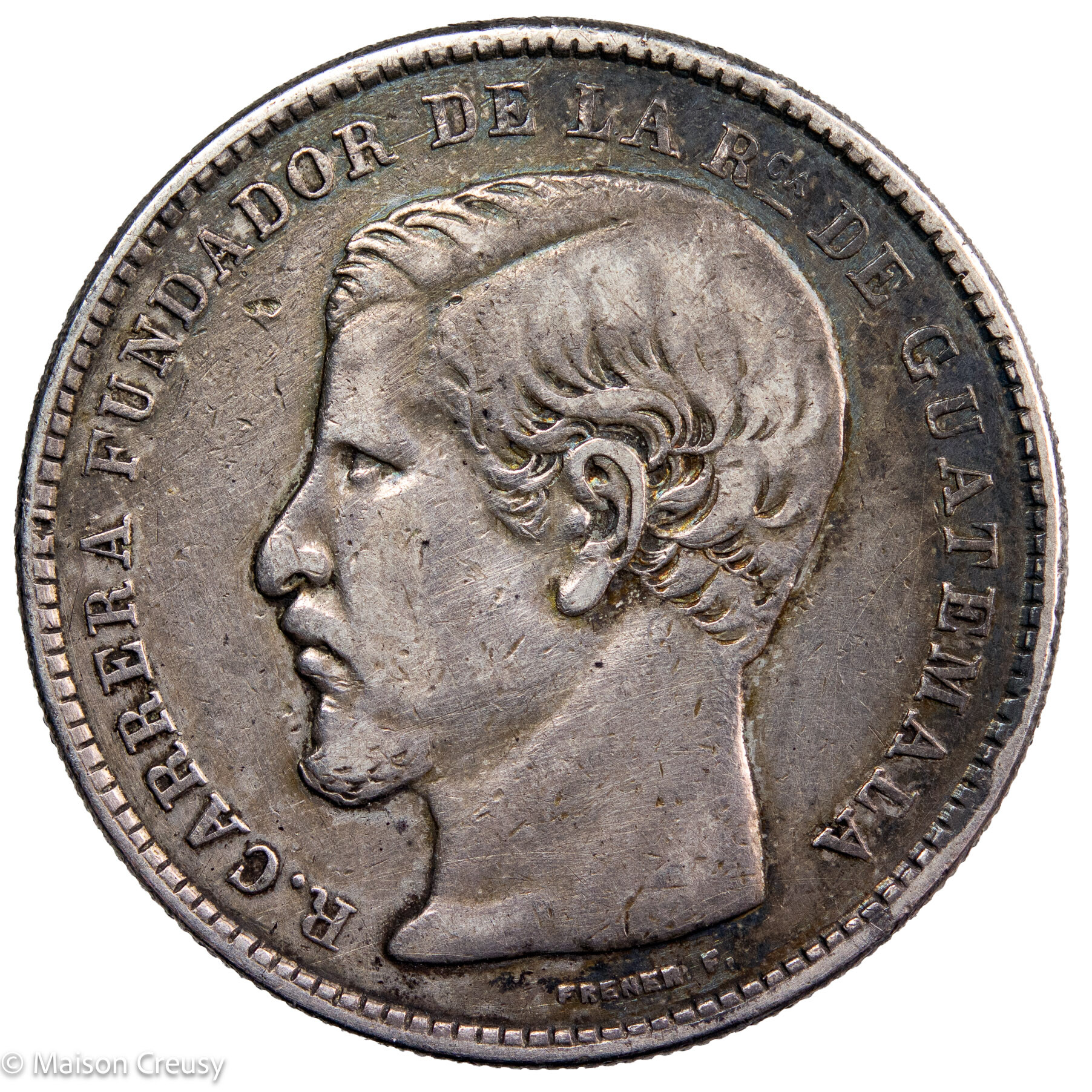 Pièce en argent d’un Peso du Guatemala frappé en 1867.  173000 exemplaires frappés. Tête de Rafael Carrera à gauche fondateur de la république du Guatemala