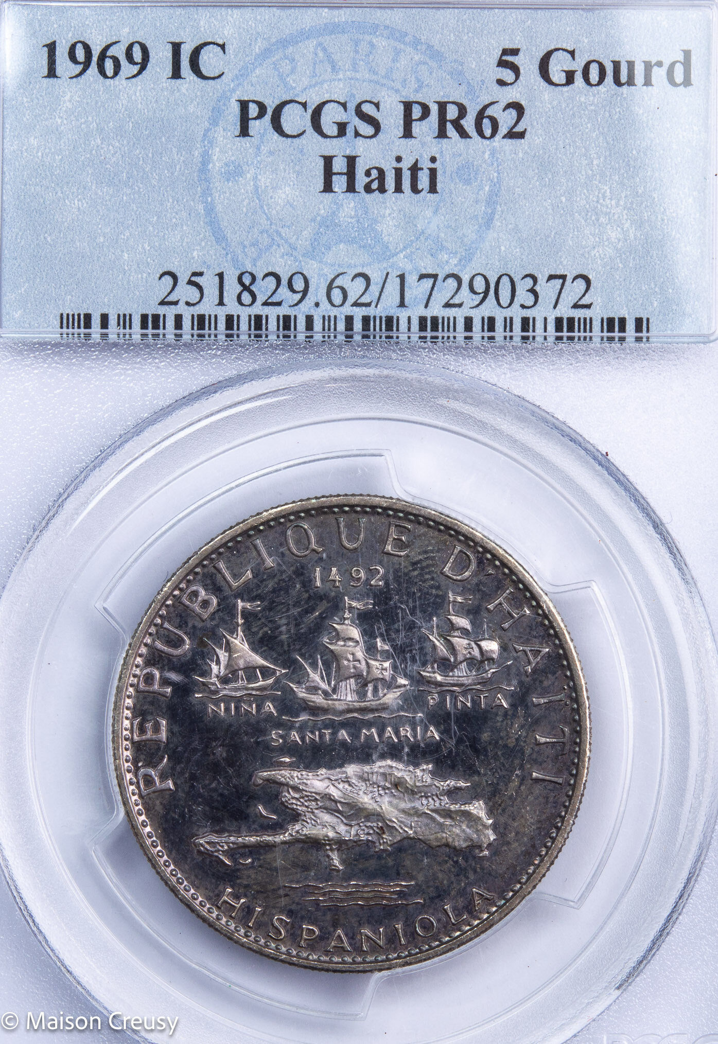 Monnaie en argent à 999 millième, 5 gourdes d’Haiti frappée en 1969 pour commémorer le dixième anniversaire de la révolution et la découverte de l’Amérique par Christophe Colomb. Les trois navires de Christophe Colomb (Nina, Santa Maria, Pinta) et l’ile d’Haïti.
