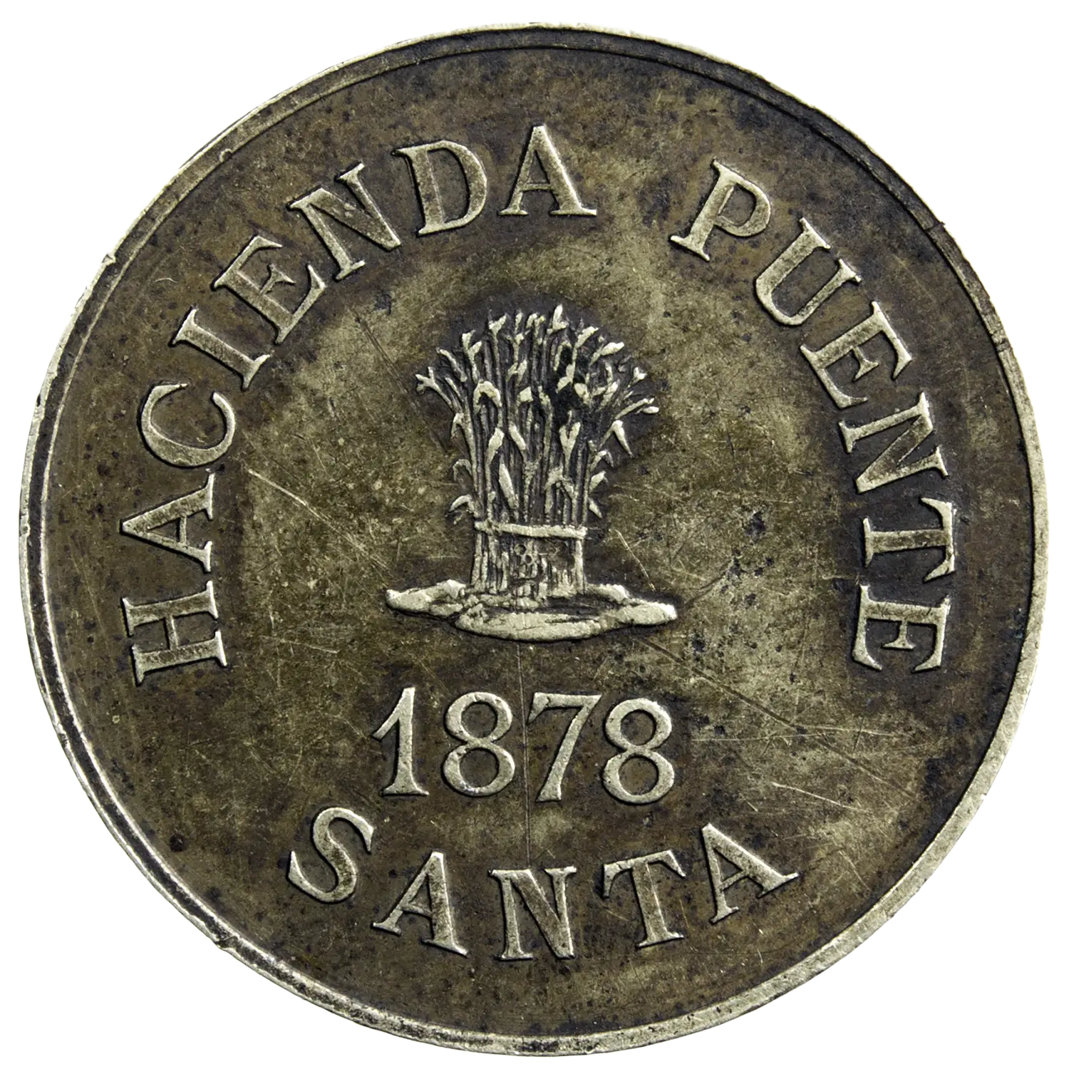 Il s’agit d’un jeton d’hacienda (monnaie de nécessité) du Pérou, daté de 1878, émis par l’Hacienda Santa, propriété de Dionisio Derteano, figure importante de l’élite péruvienne du XIXe siècle. Ces jetons, ici d’une valeur de 10 centavos, étaient utilisés comme monnaie interne pour payer les ouvriers agricoles, souvent dans des plantations de canne à sucre ou de coton, comme le suggère la gerbe au revers. Le jeton servait de bon d’achat valable uniquement dans l’hacienda elle-même. Ce type de jeton témoigne du système semi-féodal des grandes exploitations agricoles d’Amérique latine à l’époque.