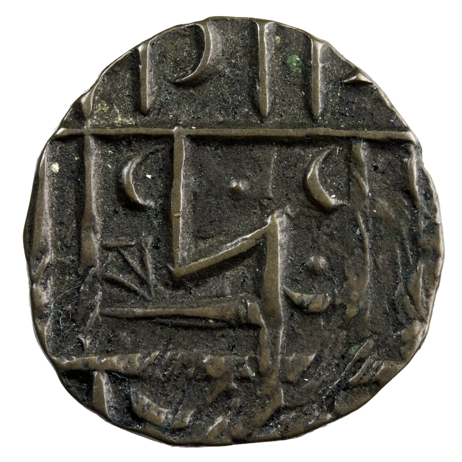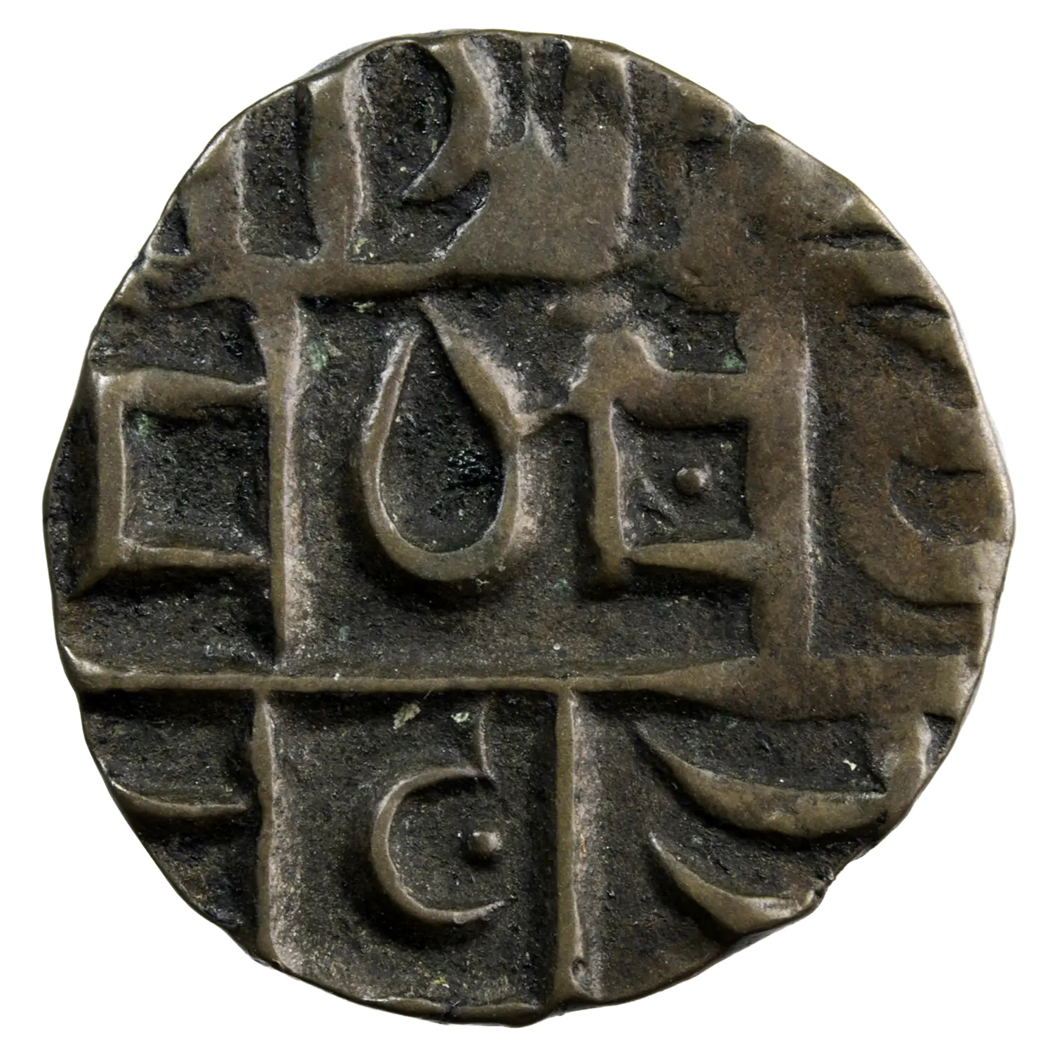 1/2 roupie frappée pour le Bhoutan, monnaie de cuivre frappée vers 1820-1835. elle fait partie des premières monnaies frappées pour ce pays