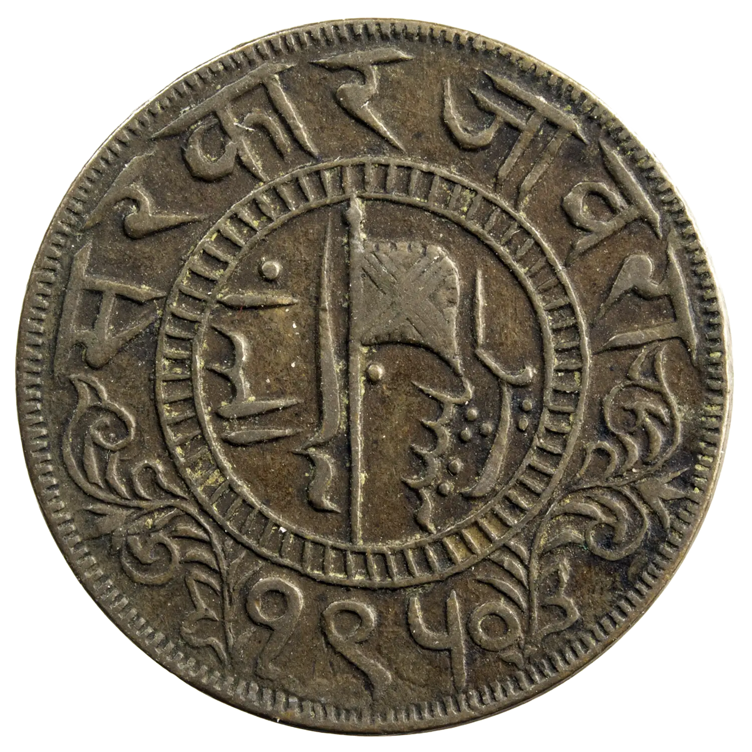 Fait rare, la pièce affiche trois systèmes de datation différents : 1893 (calendrier grégorien), 1310 (calendrier hégirien AH) et 1950 (calendrier Vikram Samvat VS).