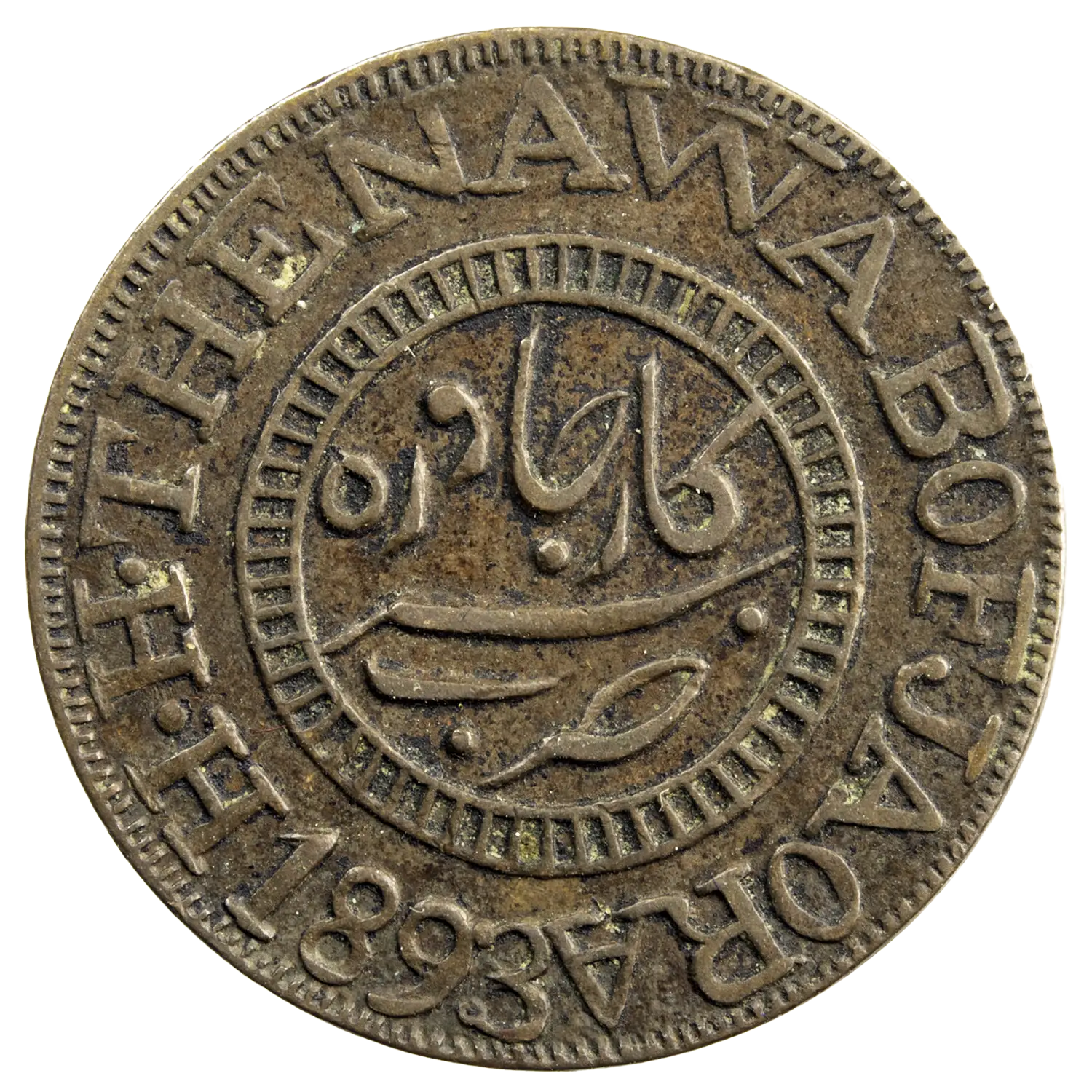 Un drapeau central entouré d’inscriptions en urdu et en hindi (Devnagari) à l’avers et au revers au centre Zarb Sarkar Jaora en ourdou et autour la légende en anglais « H.H. THE NAWAB OF JAORA 1893 »