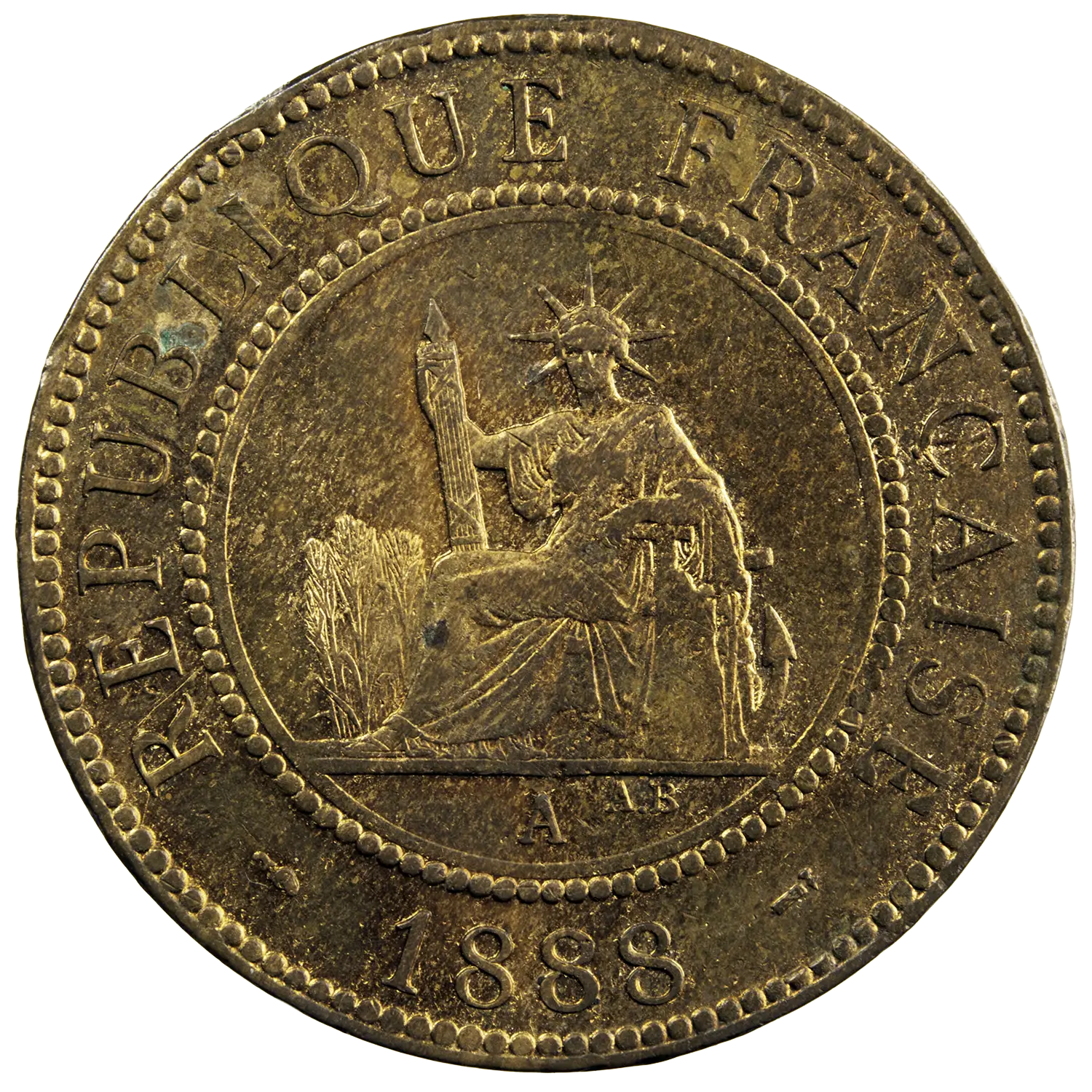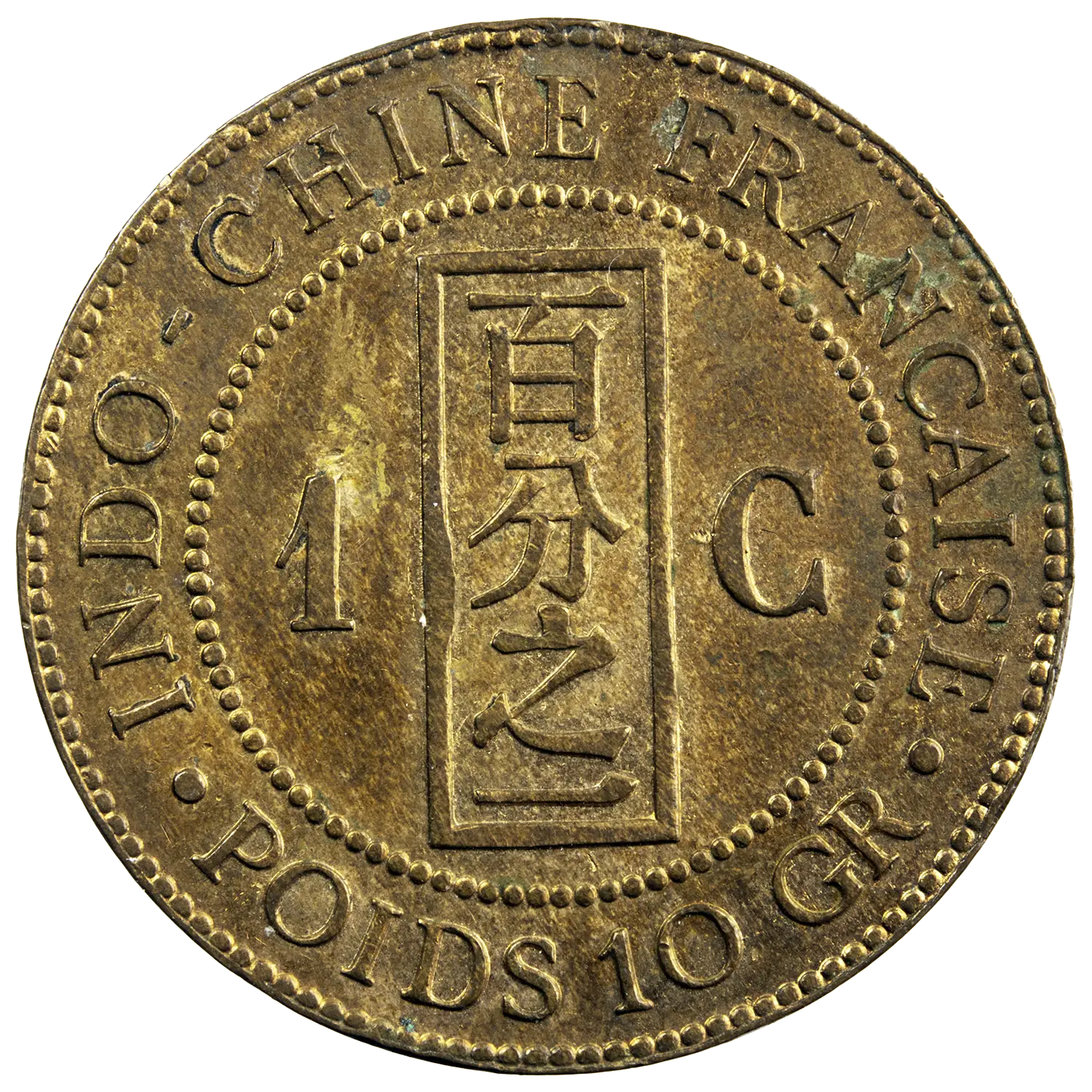Pièce d’un centième frappée pour l’Indochine française en 1888 à Paris.  Allégorie de la république à l’avers et au revers la valeur la légende du cartouche central 百分之一 signifie 1 centième.