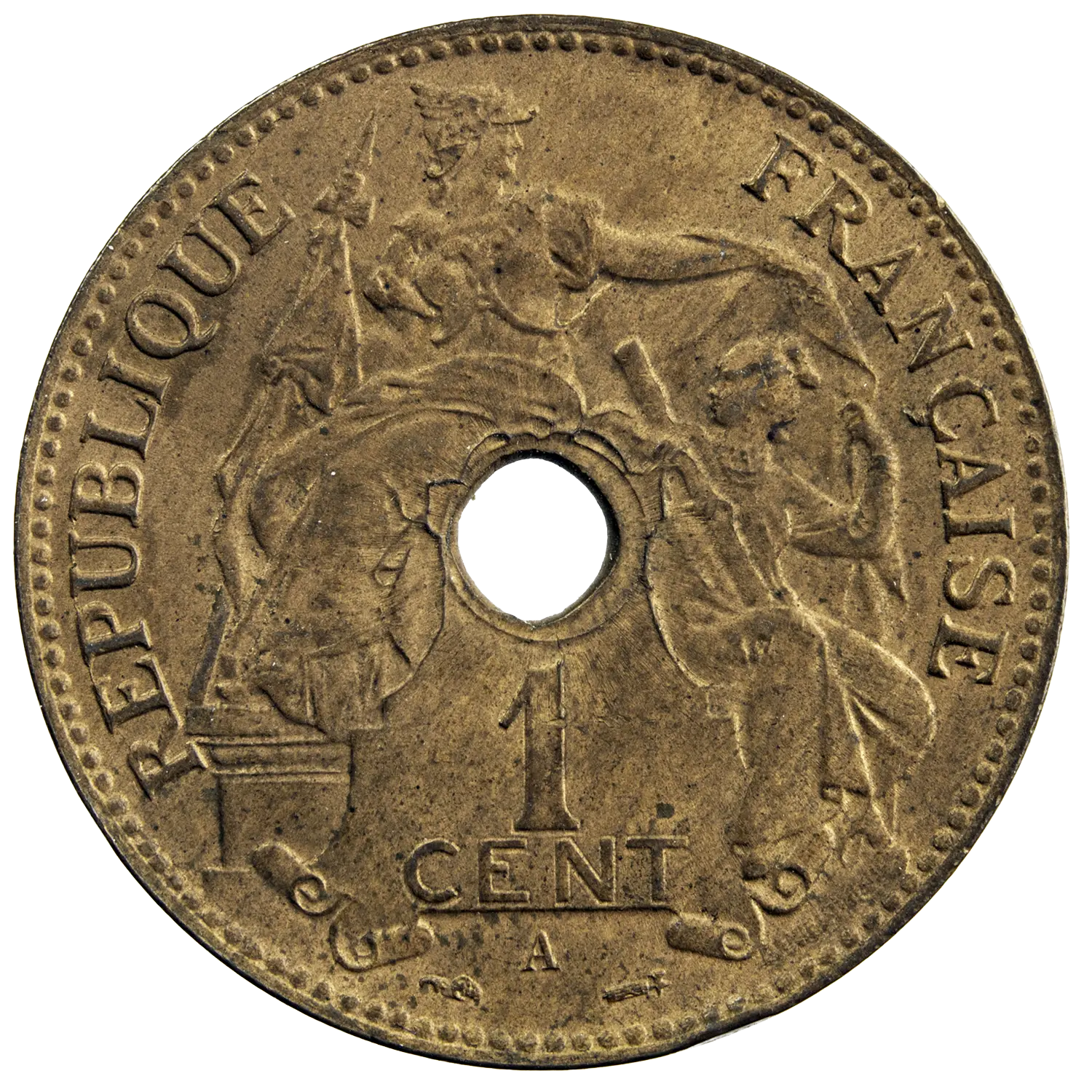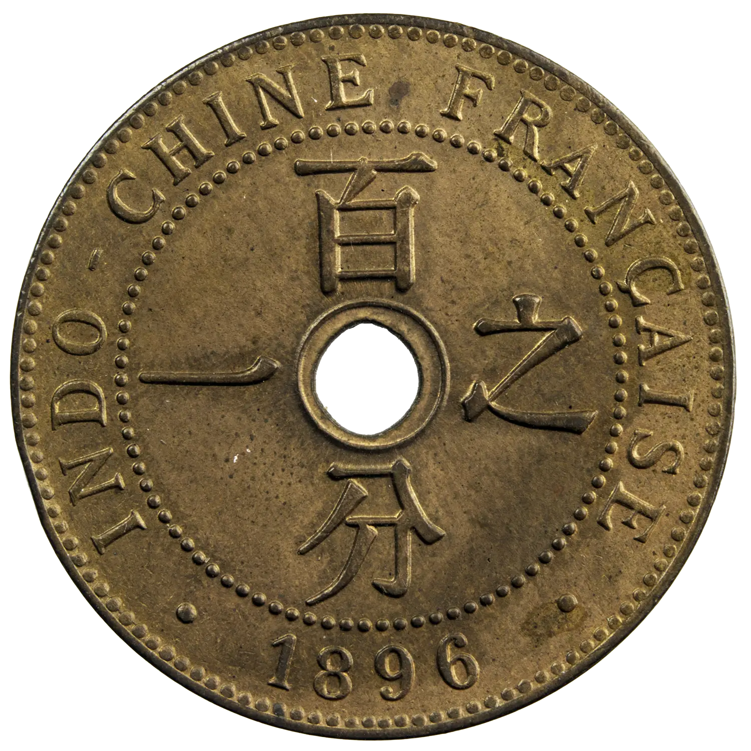 Pièce d’un cent frappé pour l’Indochine française en 1896 à Paris. A l’avers allégorie de la république et au revers legende : 一百分之 INDOCHINE FRANÇAISE